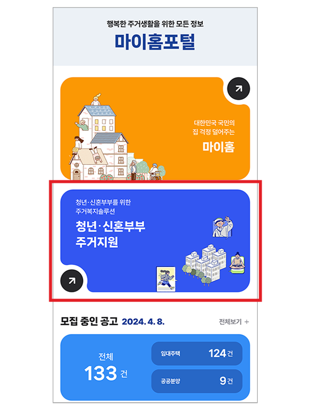 사용 방법은 간단하다. 인터넷 혹은 앱스토어에서 ‘마이홈포털’을 검색하면 준비 끝. 최근 리뉴얼을 거치며 접근성이 더 좋아졌다. 대학생은 두 번째 ‘청년·신혼부부 주거지원’ 메뉴를 클릭하자.