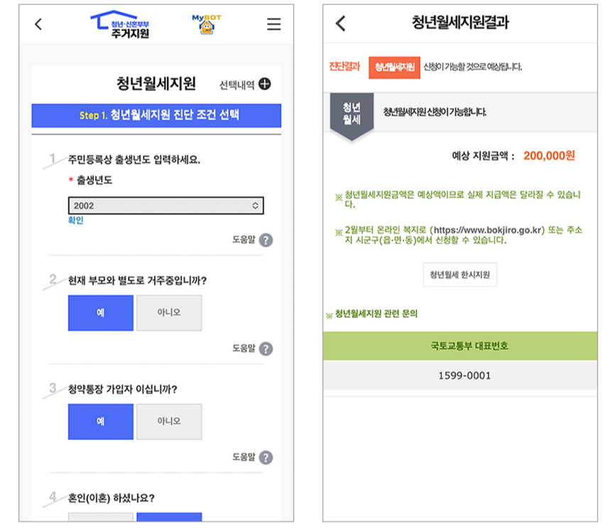 예시를 들기 위해 가상의 대학생 A로 빙의하여 정보를 입력했다. 헷갈리는 부분이 있어도 항목마다 도움말이 있어서 편했다. 결과는? 매월 20만 원 지원이 가능했다. 1년이면 240만 원이다. 그런데 이 메뉴에 들어오기도 귀찮다? 그러면 더 쉬운 방법이 있다.