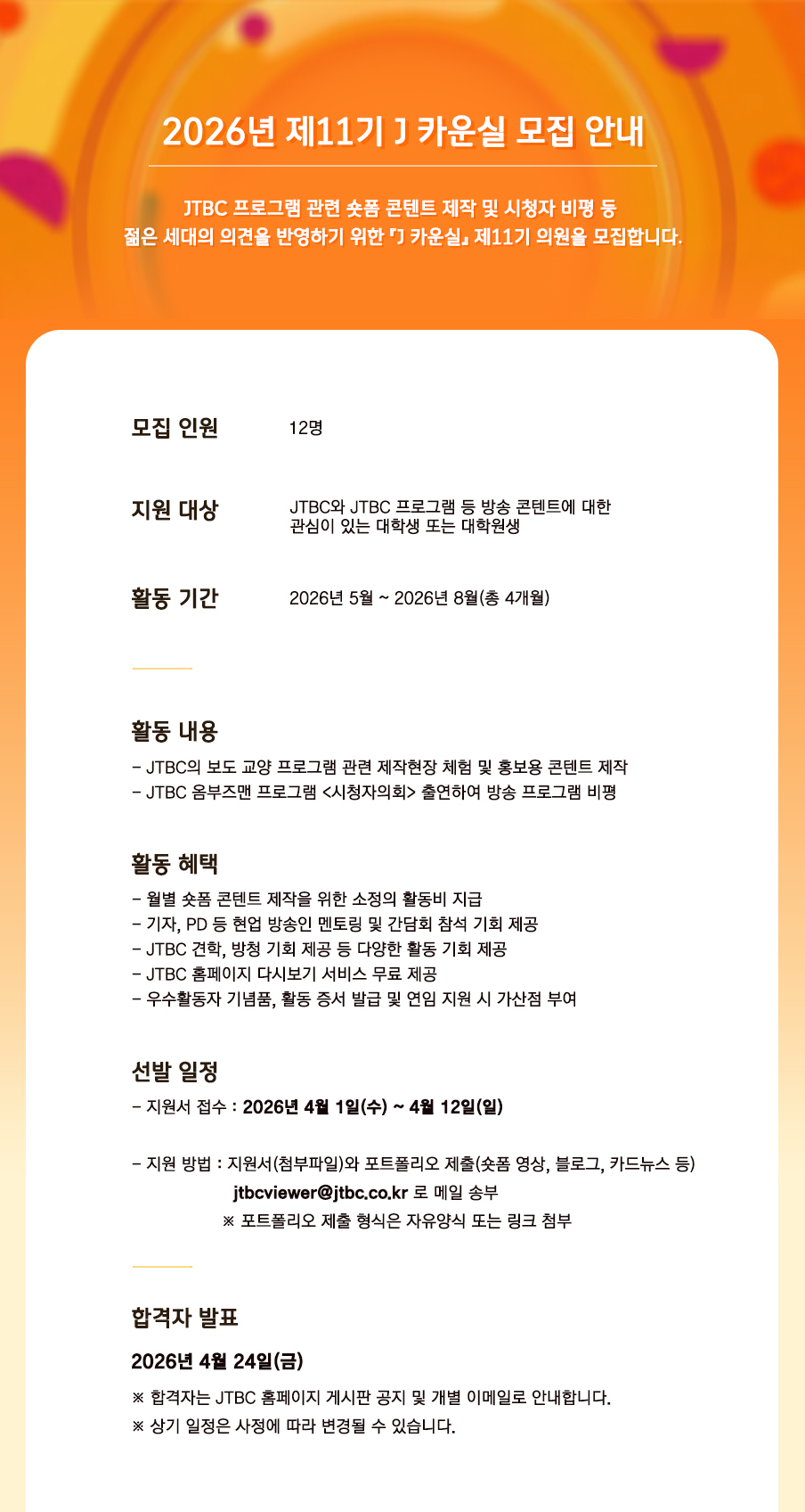 ※ 지원 방법 : 지원서(다운받기)와 포트폴리오 jtbcviewer@jtbc.co.kr로 제출(숏폼 영상, 블로그, 카드뉴스 등)