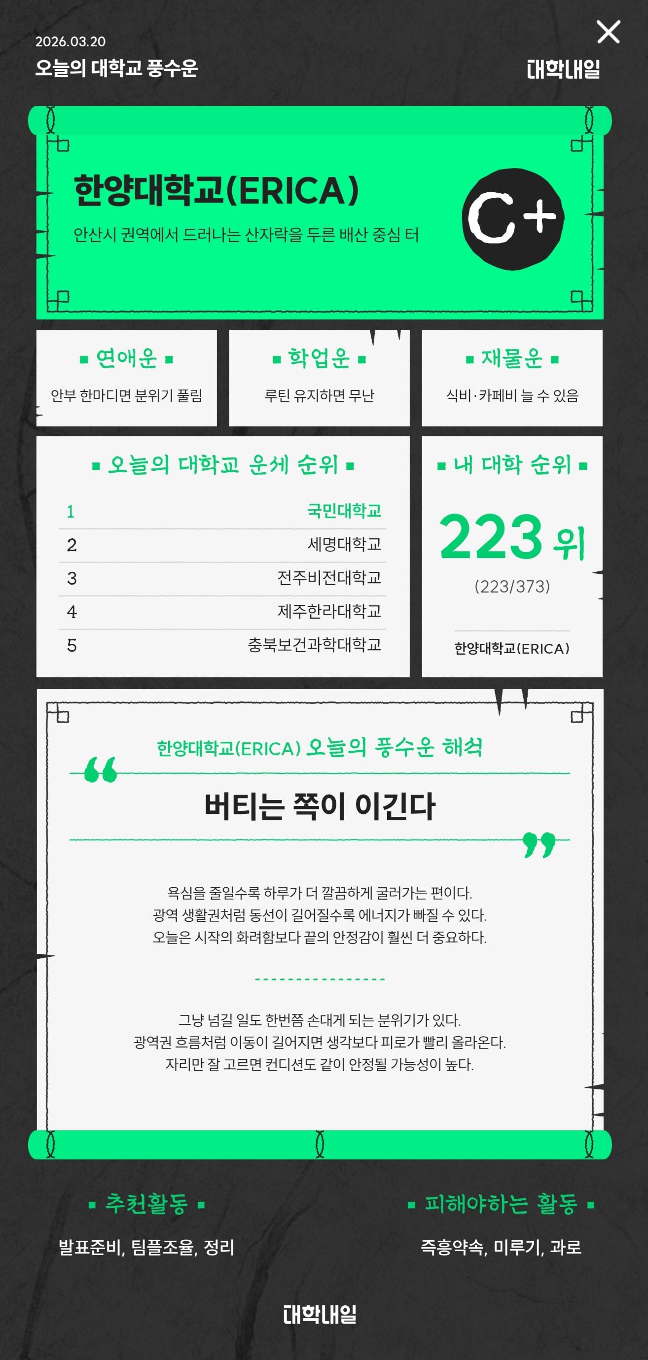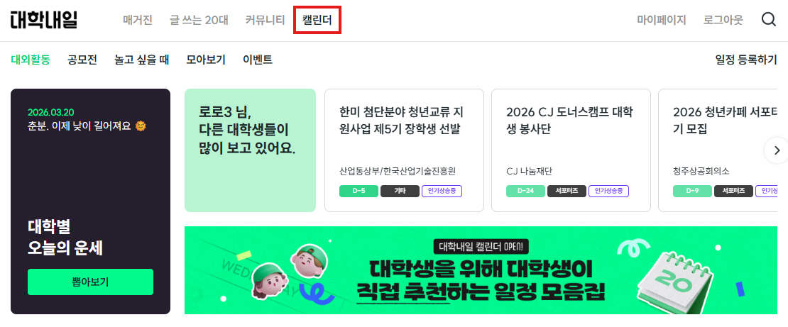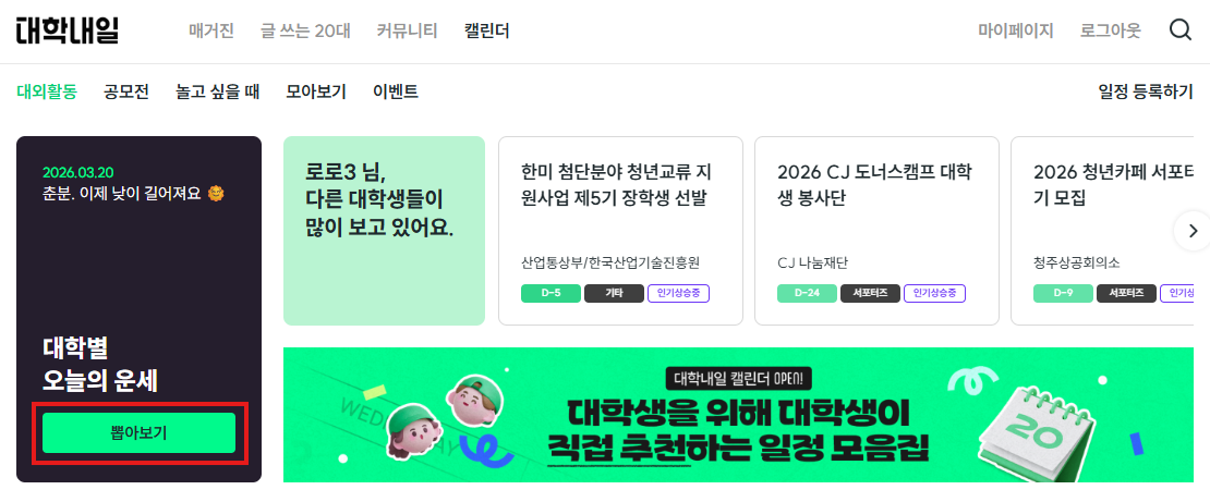 인기글 자유게시판 인기글 대학별 오늘의 운세 뽑기 서비스 오픈 🍀 대학내일 게시일 2026-03-20 오후 3:01:31 조회수 1130 좋아요 0 우리 학교의 풍수지리는 어떨까?대학내일이 오픈한 대학별 오늘의 운세 뽑아 보세요!💫 우리학교 오늘의 운세 뽑는 방법1. 대학내일 홈페이지 > 캘린더 클릭2. 대학별 오늘의 운세 > 뽑아보기 클릭※ 대학생 인증이 필요한 서비스입니다.대학별 오늘의 운세 뽑기바로가기 신고