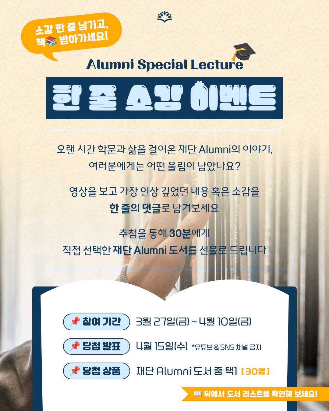영상 보고 소감 한 줄 남기면, "직접 선택한 Alumni 도서"를 선물로 드립니다! 📚