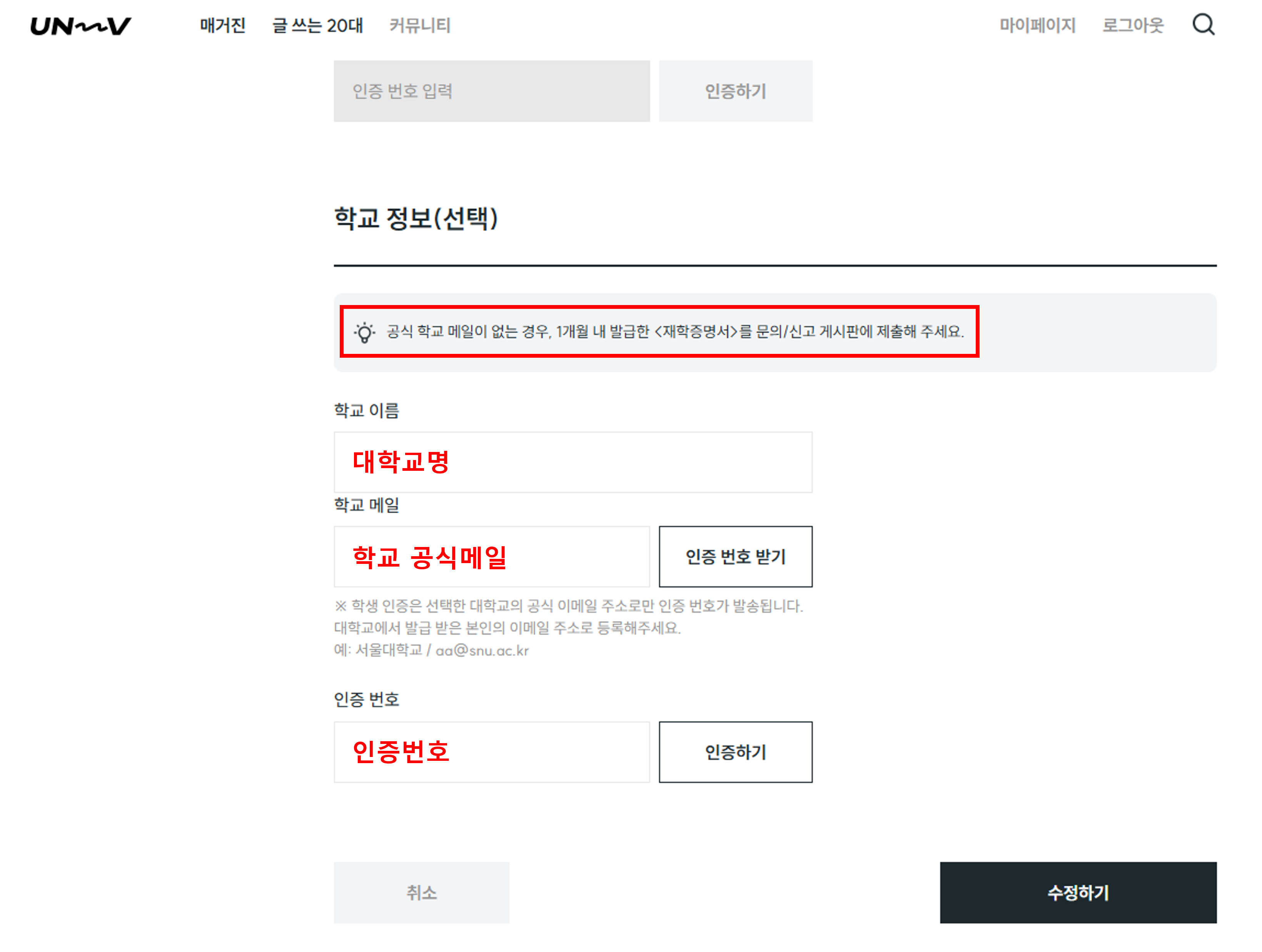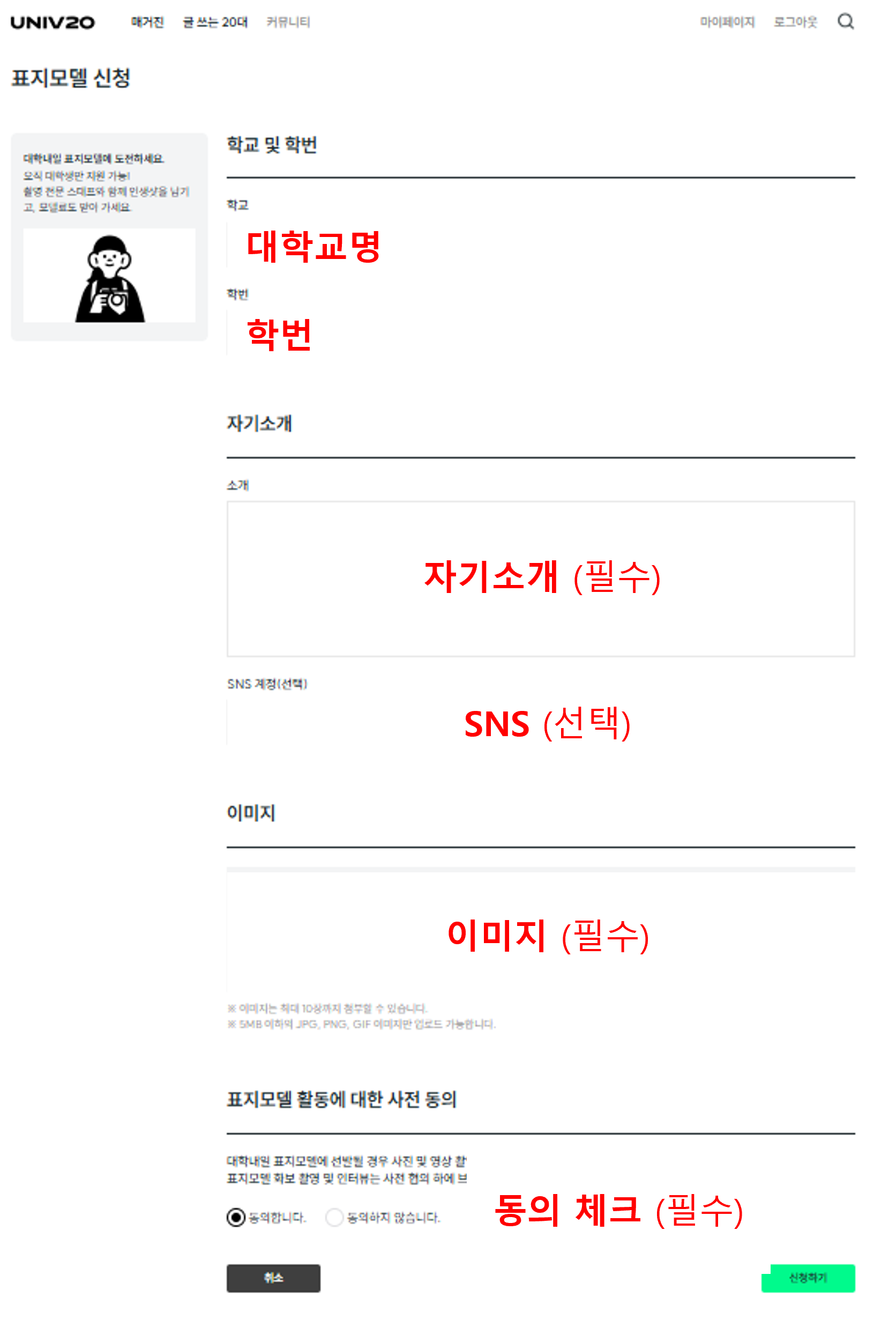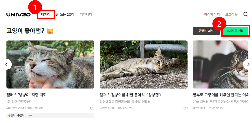 인기글 자유게시판 인기글 대학내일 표지모델 신청 방법 로로 게시일 2025-10-01 오전 12:14:15 조회수 126 좋아요 0 표지모델 신청 방법https://univ20.short.gy/표지모델신청UNIV20 홈페이지 > 매거진 > 표지모델 신청* 로그인 및 대학생 인증 필요대학생 인증https://univ20.short.gy/내정보수정UNIV20 홈페이지 > 마이페이지 > 내 정보 수정 > 프로필 수정 > 학교 정보(선택)학교 공식메일 없는 경우 문의/신고 게시판(바로가기)에 1개월 내 발급한 재학증명서 제출 신고