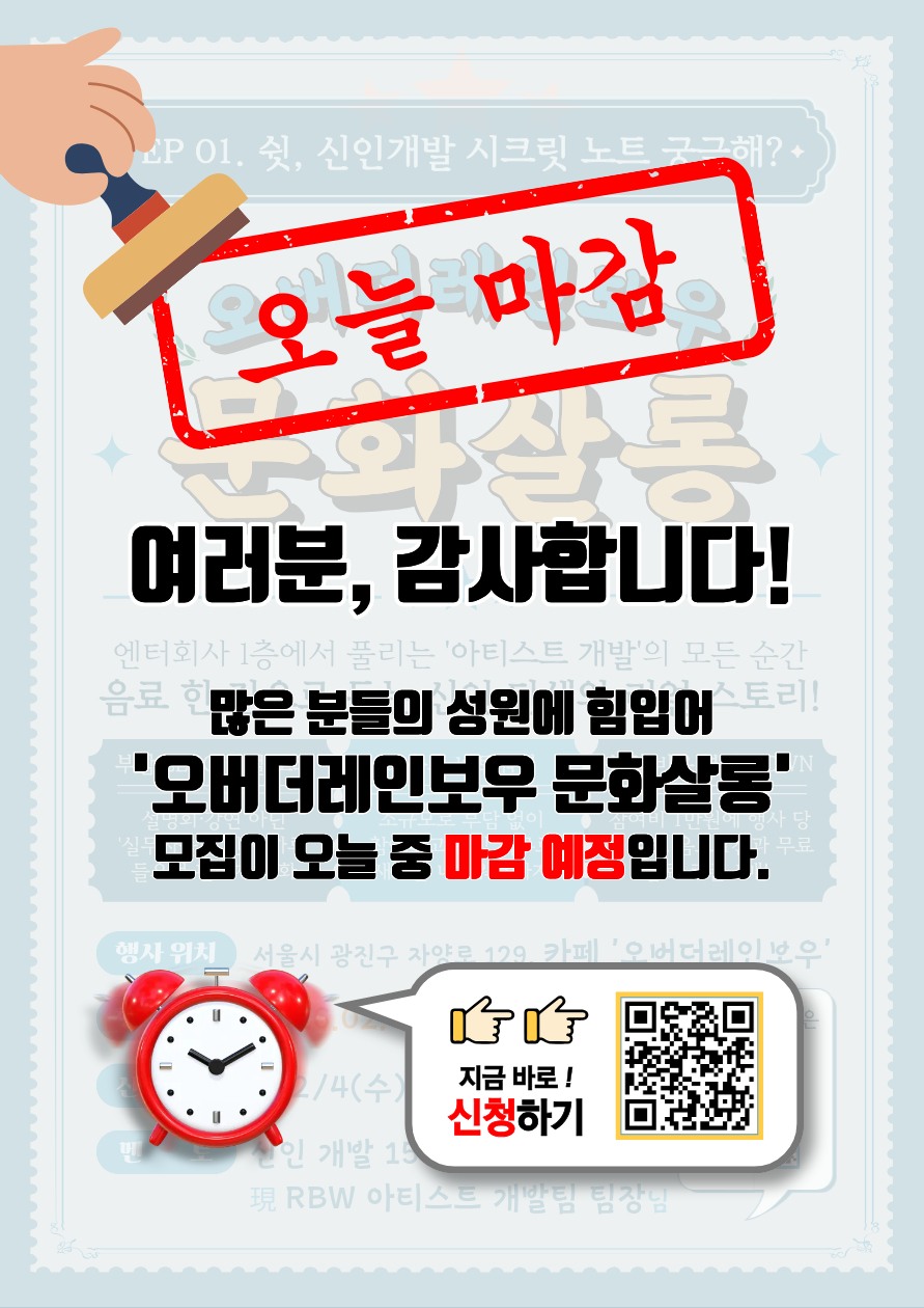 #오버더레인보우문화살롱 #오늘마감 #마감임박 #엔터현직자 #신인개발 #아티스트개발 #엔터토크 #소규모네트워킹 #RBW #오버더레인보우