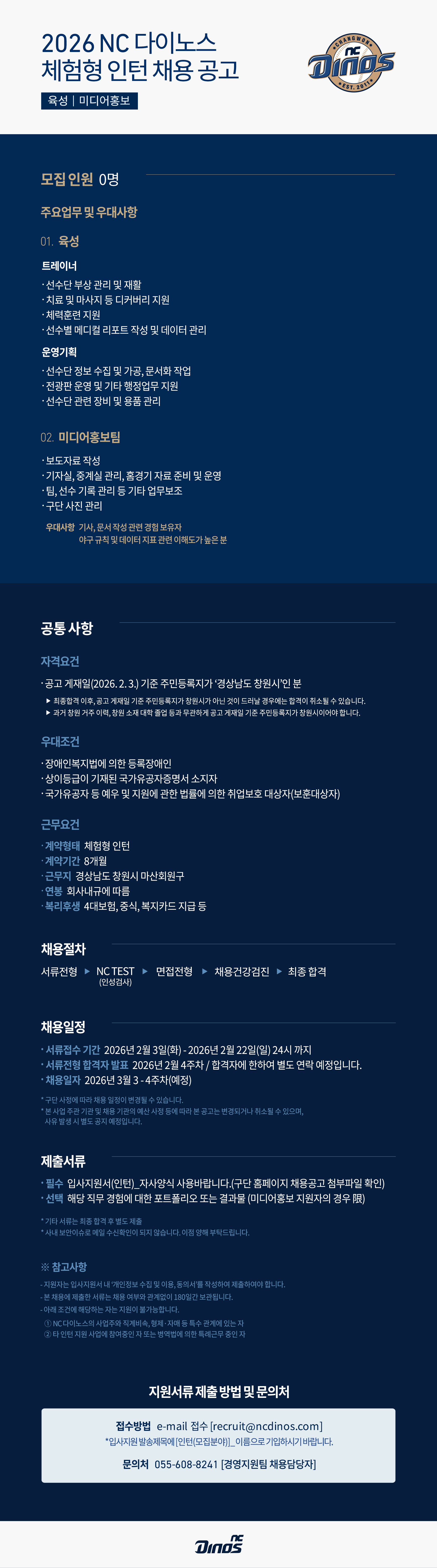 2026 NC 다이노스 체험형 인턴 채용 공고 (육성/미디어홍보)