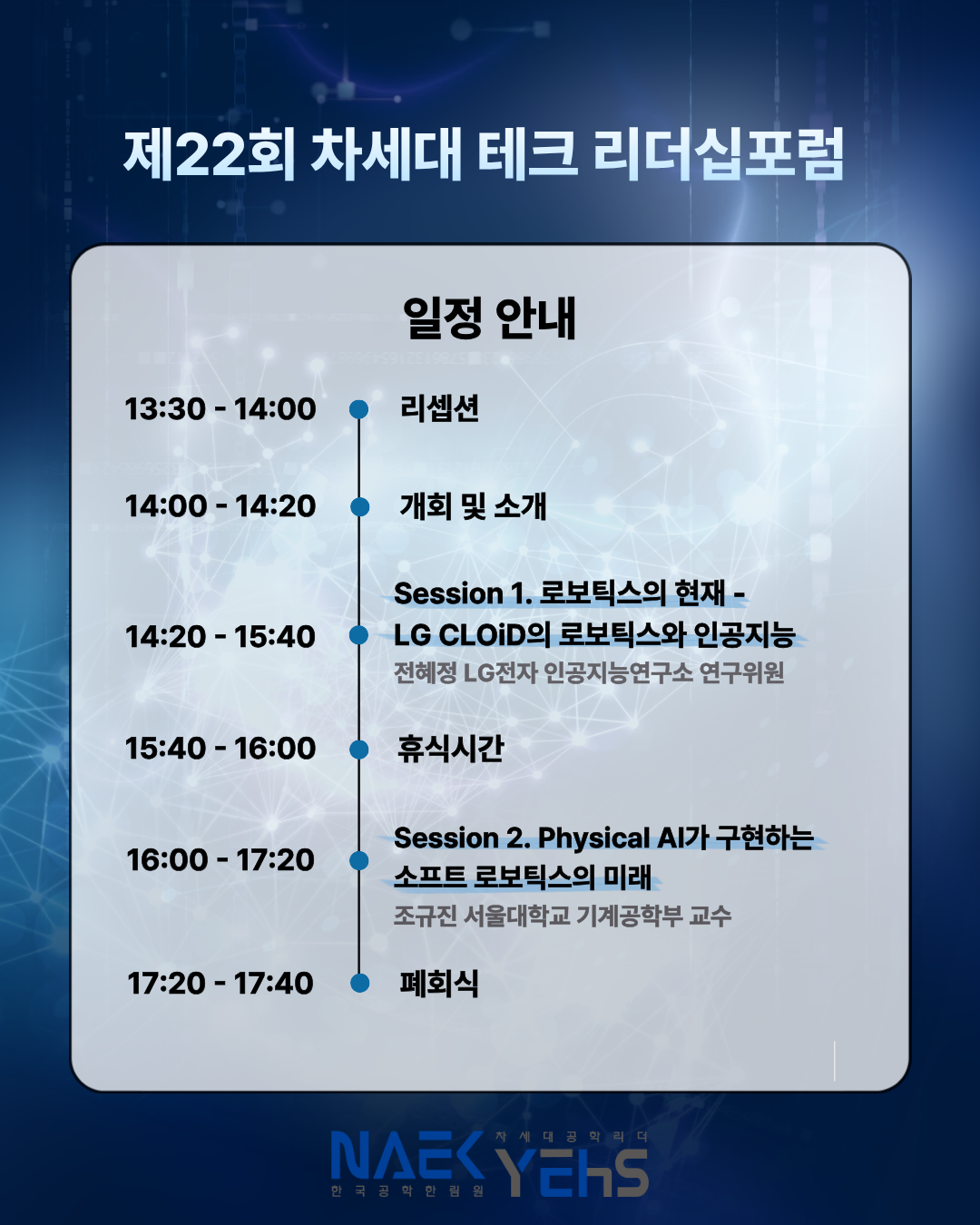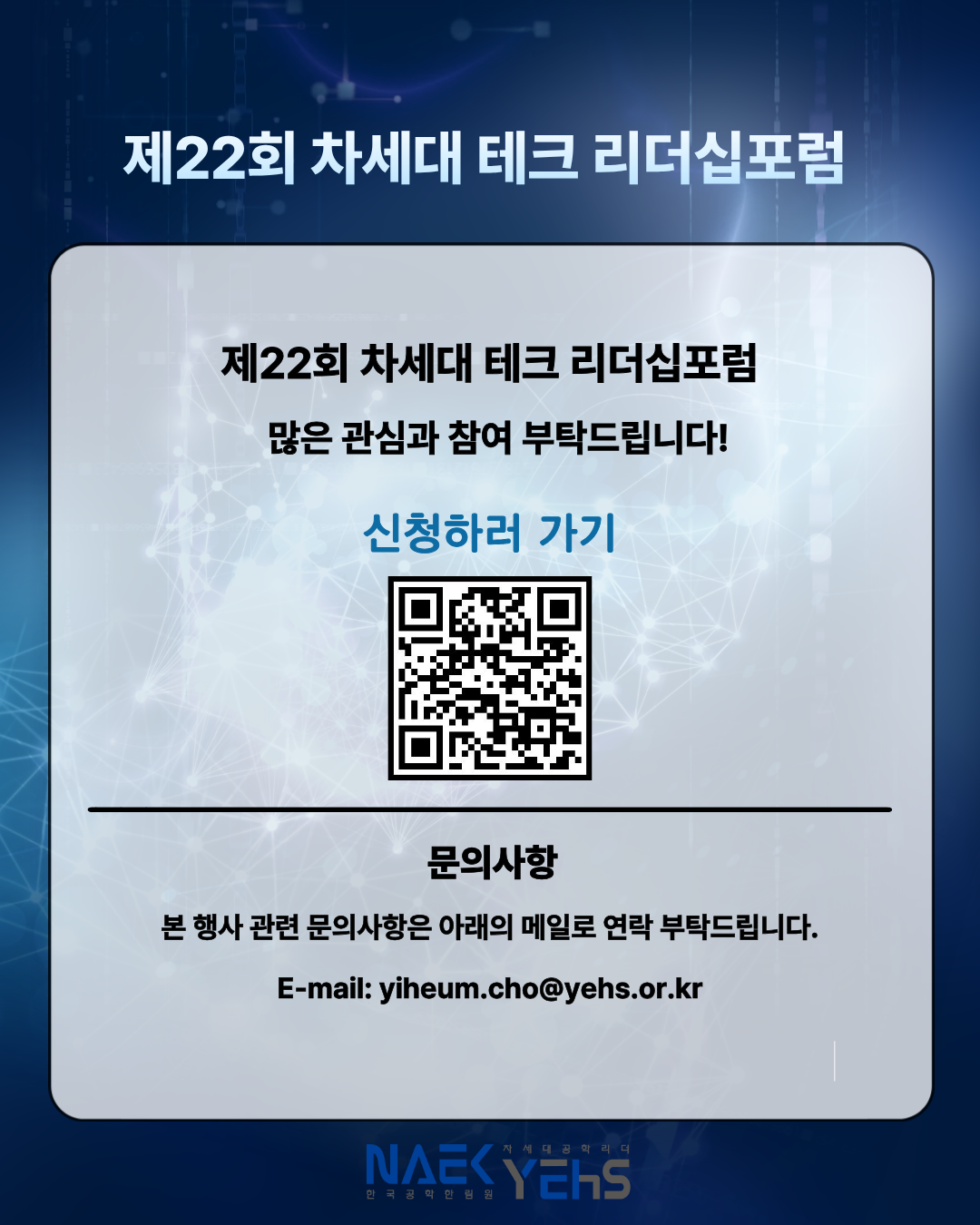한국공학한림원 산하의 차세대공학리더 YEHS에서 제22회 차세대 테크 리더십포럼을 개최합니다!