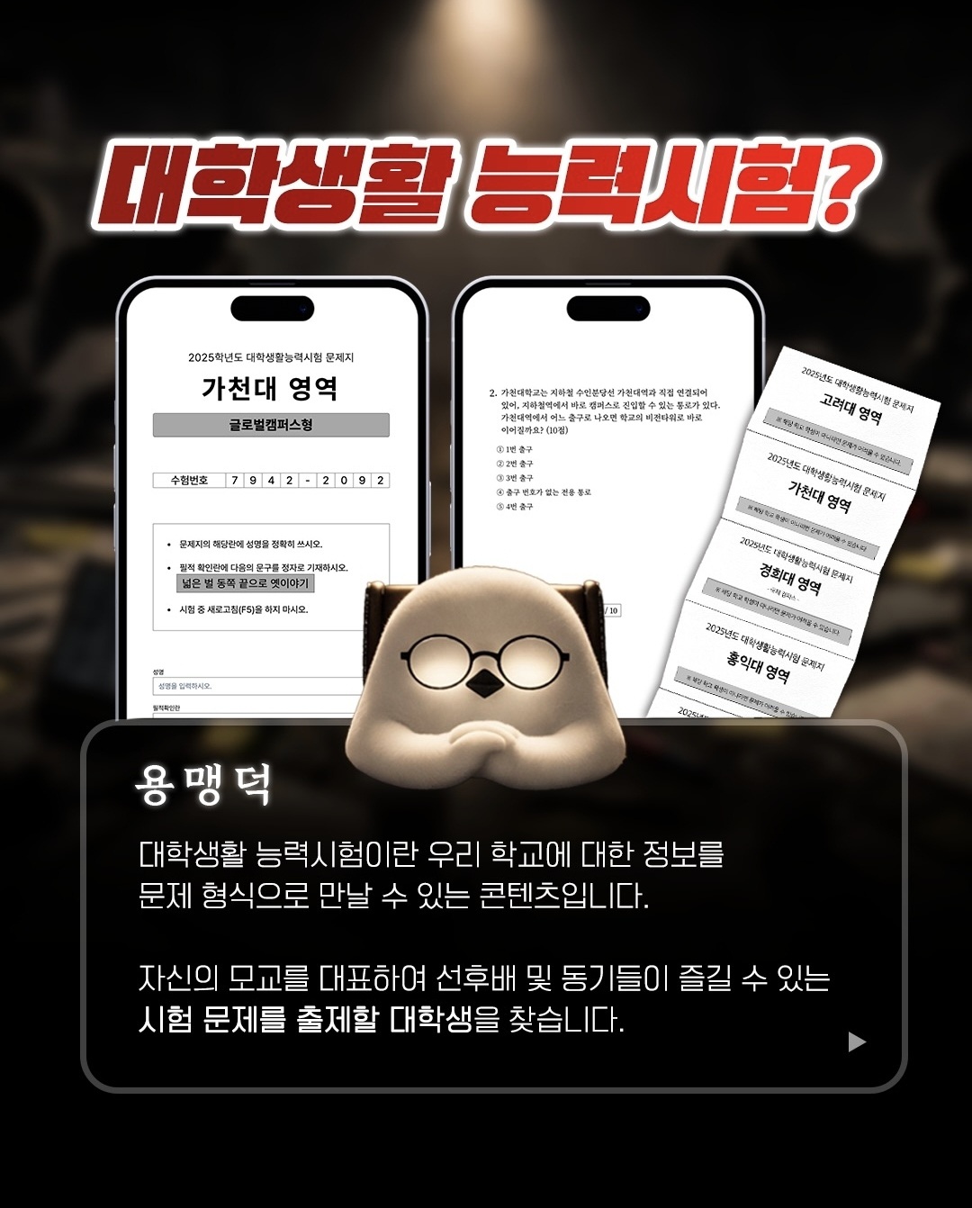 대학생활 능력시험이란 우리 학교에 대한 정보를 재밌는 문제 형식으로 만날 수 있는 콘텐츠예요.