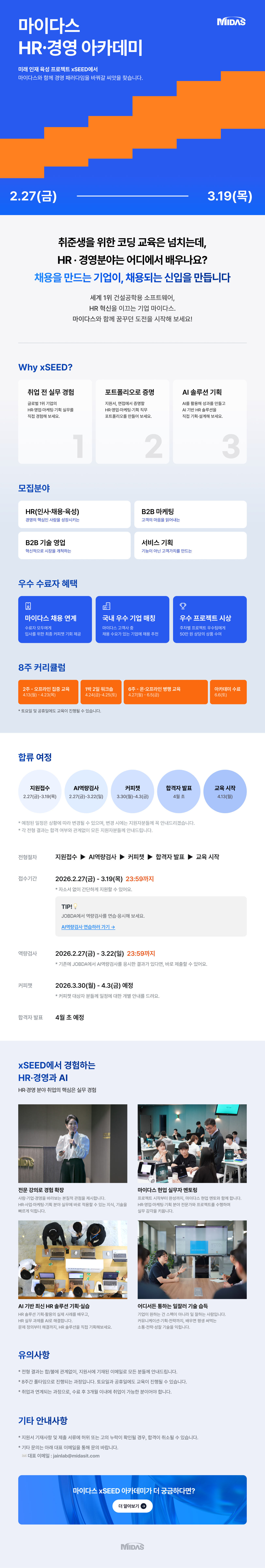자유게시판 [채용연계] 마이다스 HR·경영 아카데미 마이다스아이티 게시일 2026-03-05 오후 4:28:56 조회수 8 좋아요 1 https://campus.midasit.com/xseed_academy_2026대한민국의 HR·경영을 선도하는 '마이다스그룹'이 '마이다스 HR·경영 아카데미' 교육생을 모집합니다. 신고