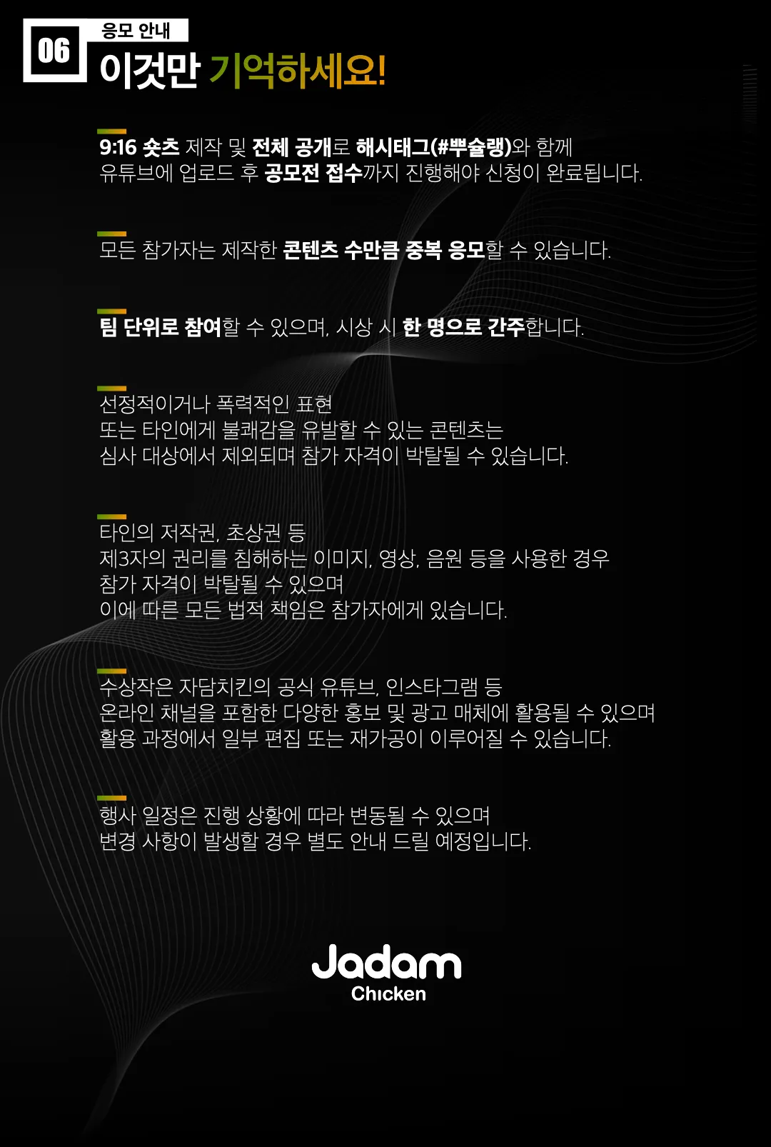 - 수상작은 자담치킨의 공식 유튜브, 인스타그램 등 온라인 채널을 포함한 다양한 홍보 및 광고 매체에 활용될 수 있으며,
