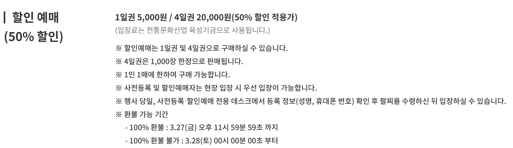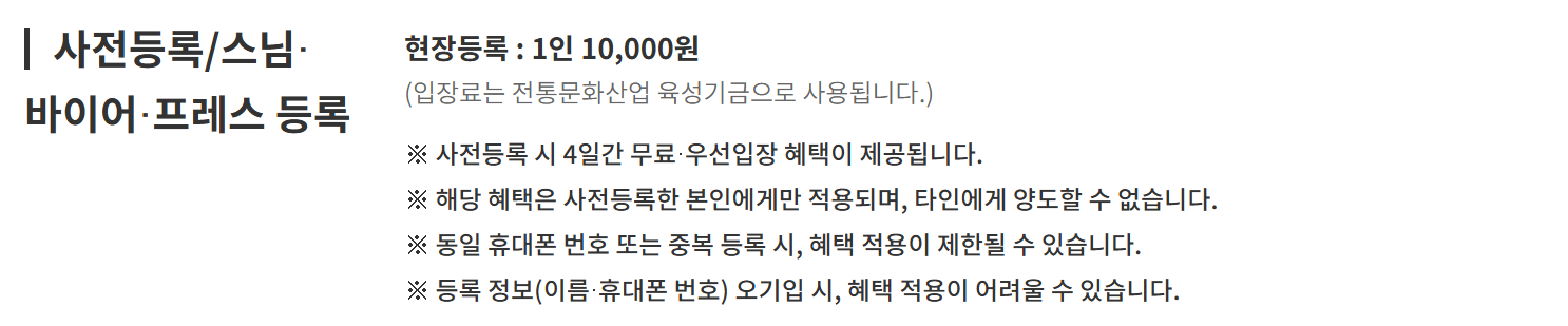 - 입장료: 10,000원 (입장료는 전통문화산업 육성기금으로 사용됩니다.)
