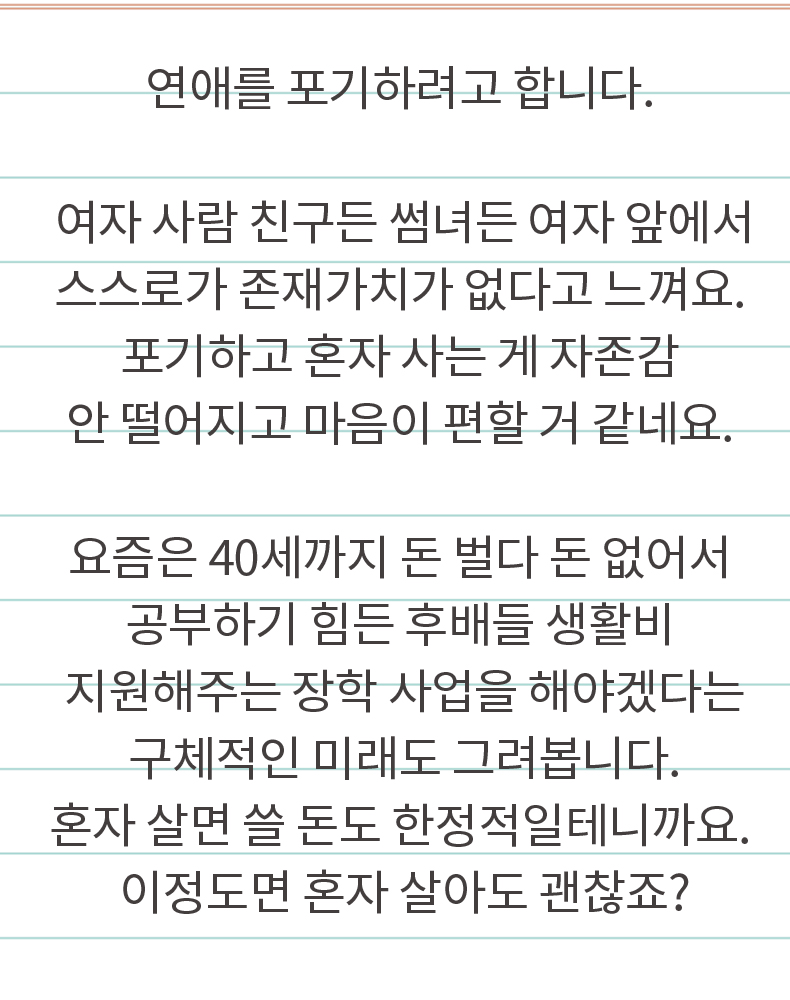 혼자 살아도 괜찮다. 연애도 자기가 행복하려고 하는거잖아? 문제는 사연자의 자존감이다. 여자랑 있으면 스스로가 쓸모없는 사람처럼 느껴진다면 비단 연애뿐만 아니라 살면서 만날 수많은 관계에서도 비슷한 좌절을 겪지 않을까? 자존감은 고정된 수치가 아니라 늘 변하는 ‘감정’이다. 자신에게 변화의 기회를 주자. 당장 눈 앞의 연애보다 앞으로 맺을 건강한 관계들을 위해서라도. 삶의 방식에 정답은 없지만 바른 예 정도는 제시할 수 있을 것이다. 혹시 모르잖아? 우연히 엿본 타인의 삶에서 해답을 얻지도. 나는 <무한도전>을 볼 때마다 정형돈의 캐릭터가 깊게 인상에 남았다. 허세를 부리는데 밉상이 아니라 귀엽다. 그는 평범이 자신의 무기일 정도로 외모도 재능도 지극히 평균적인 사람이다. 유재석의 말마따나 혁오만큼 토크를 못 하던 개그맨이 출구 없는 매력남이 된 건 잘나서라기보다 오랜 고민의 결과다. 실제로 정형돈은 많은 인터뷰에서 '노력만큼은 자신 있다'고 여러 번 이야기했다. 믿자. 자신을 변화시킬 수 있는 건 나 자신 뿐이다.
