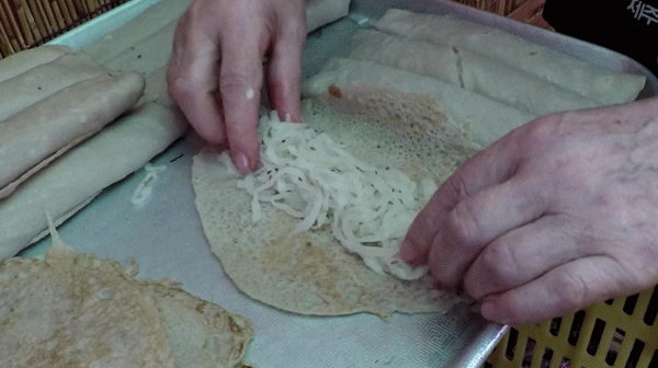 빙떡은 제주 향토 음식이다. 메밀전병인데, 속에는 참기름으로 양념을 한 무채가 들어간다. 보통 따뜻하게 먹는 전병과 달리 식혀 먹어야 하는 음식. 모양도 맛도 소박하다. 재료라고는 메밀과 무 뿐인데도 담백하고 고소하다.