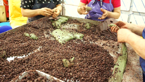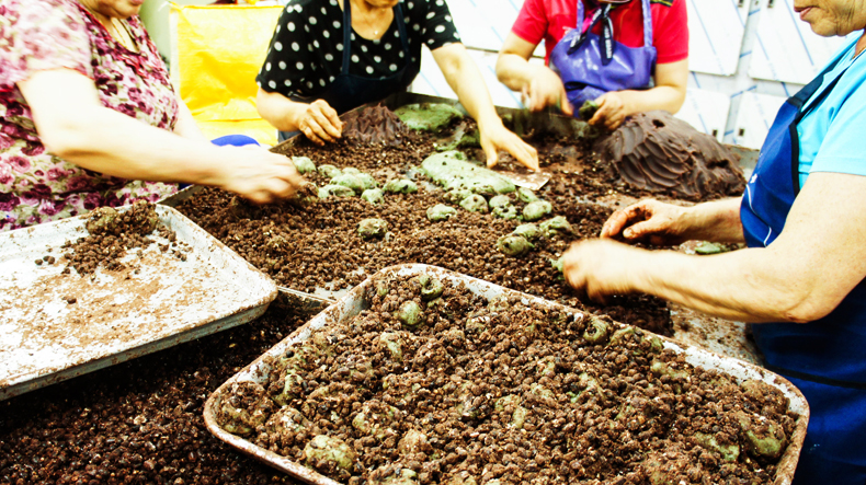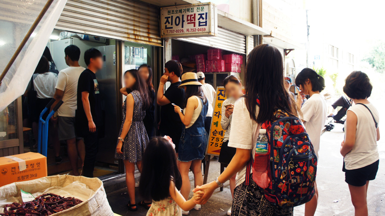 동문재래시장에는 오메기떡으로 유명한 집이 두 군데 있다. 오복떡집과 진아떡집. 그 중 진아떡집은 '수요미식회'에 나오며 더 유명해졌다. 평일인데도 사람들이 길게 줄지어 서 있다. 적게는 30분, 많게는 1시간가량 기다리기도 한다고.