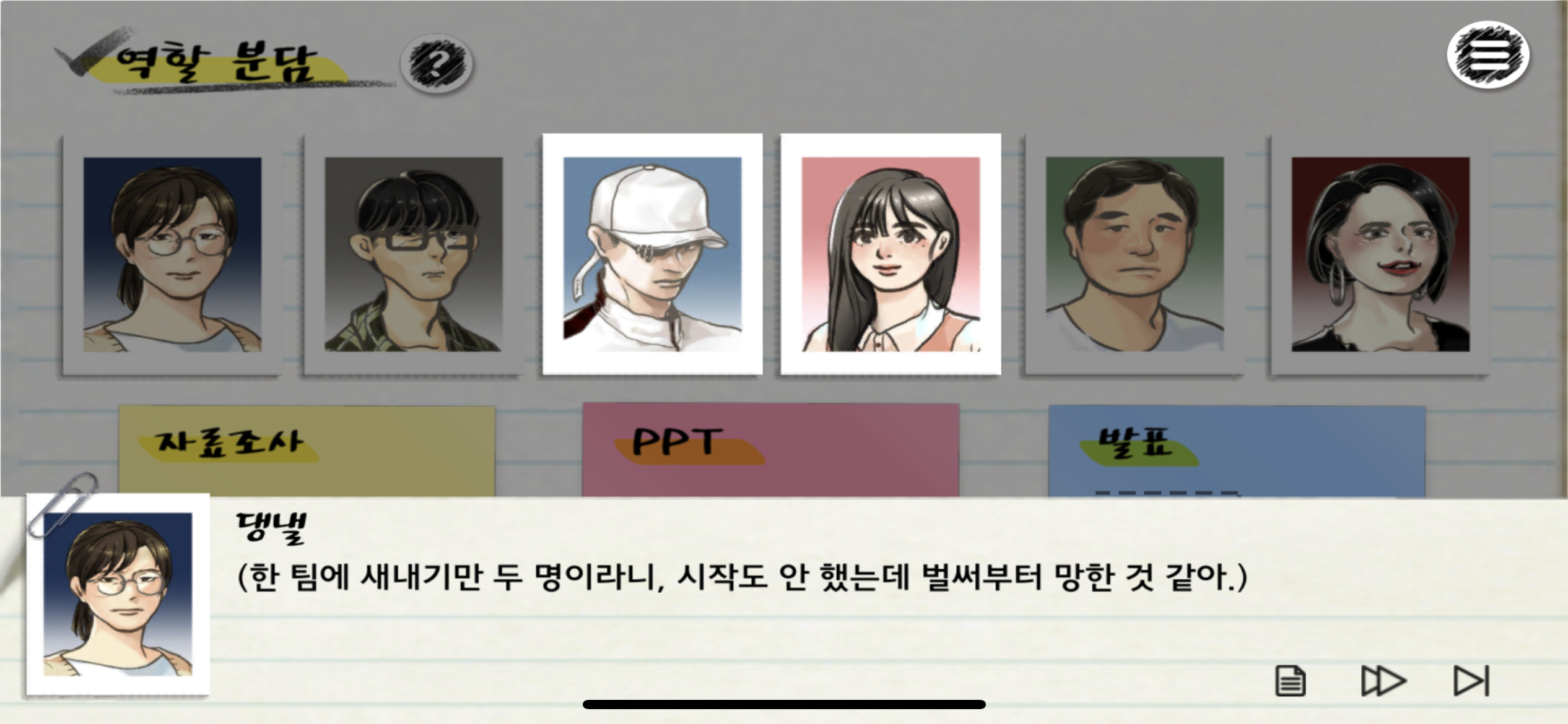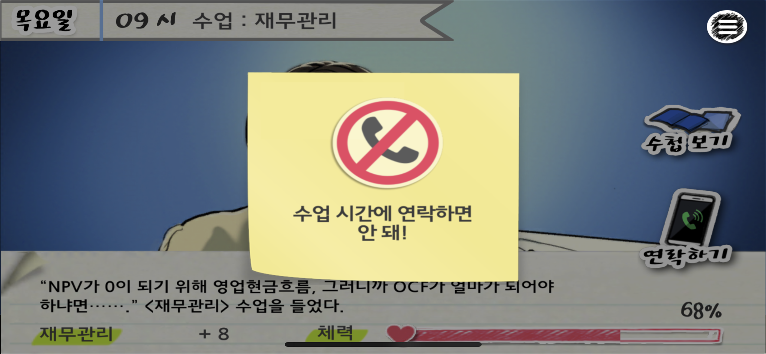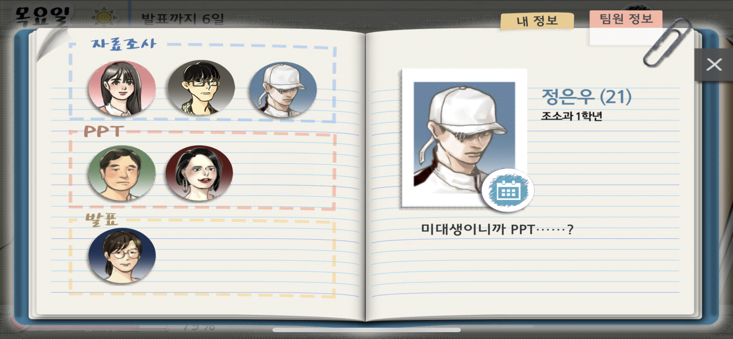 게임은 여섯 캐릭터의 학과와 시간표까지 상세하게 설정해 두었지만 난 팀원의 시간표 따위는 고려하지 않는다. 조별과제만 하면 되는 줄 알았더니 학점을 좋게 받기 위해 나도 수업을 들어야 하기 때문이다.