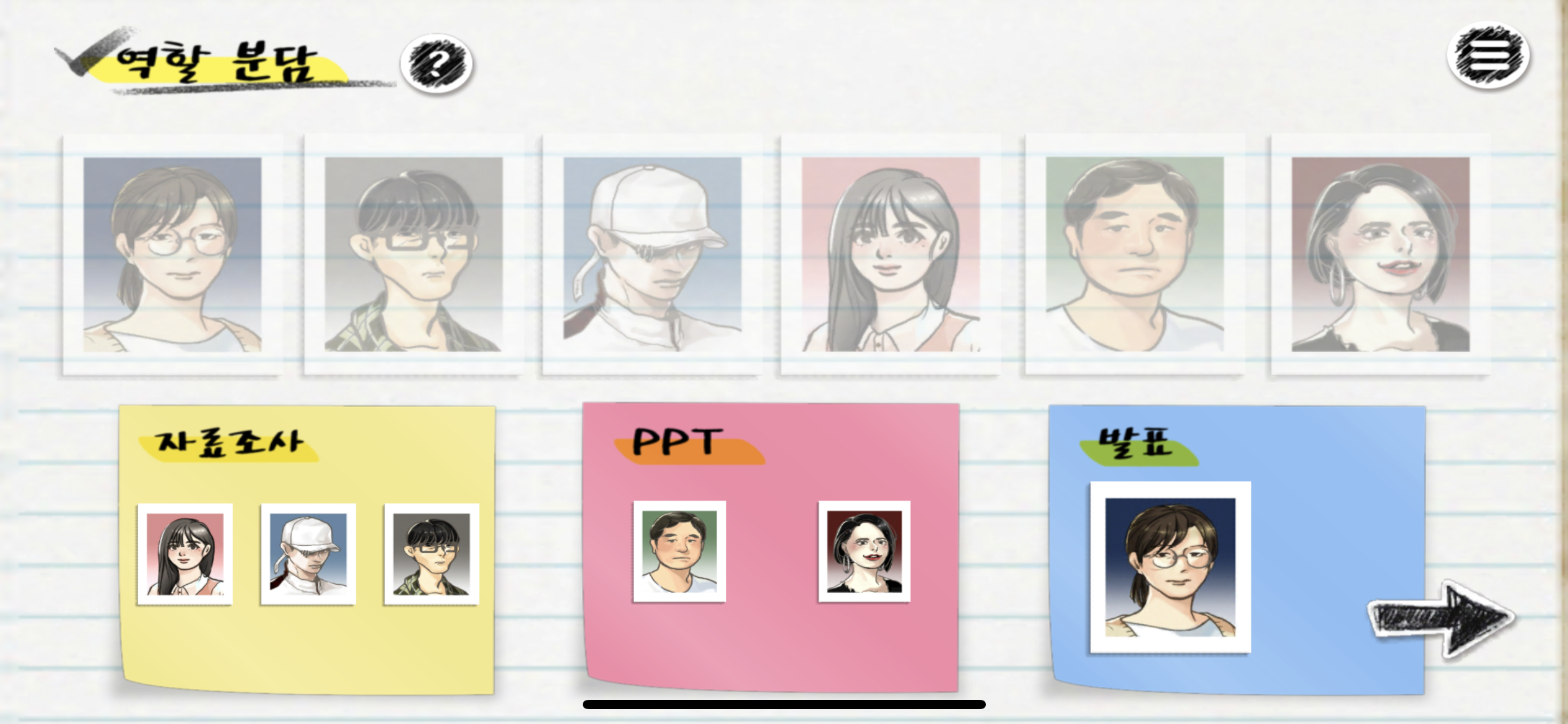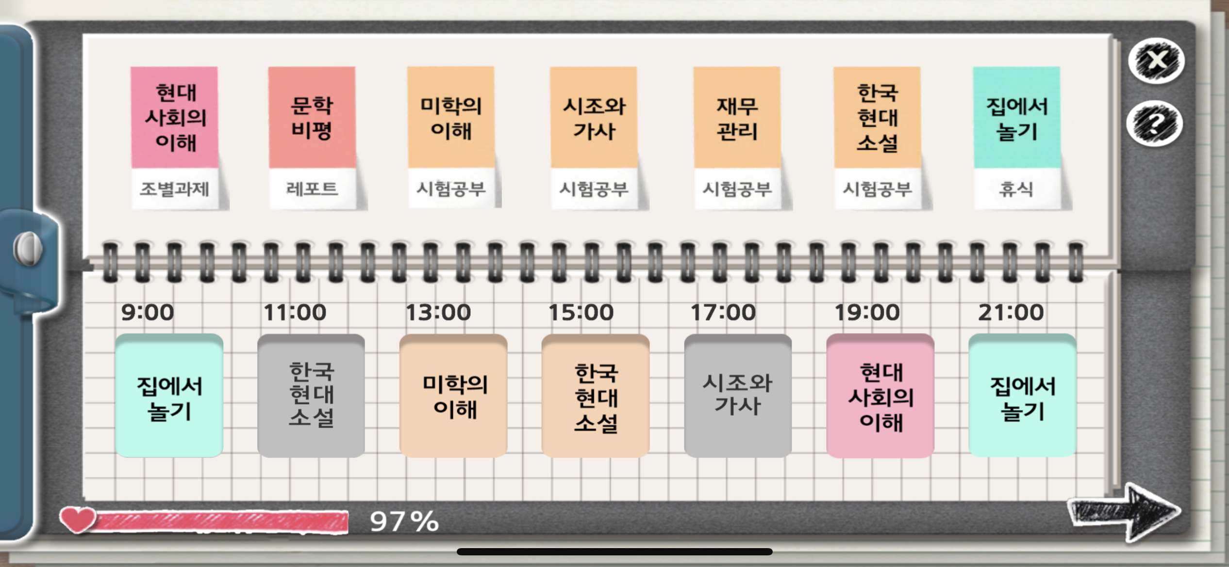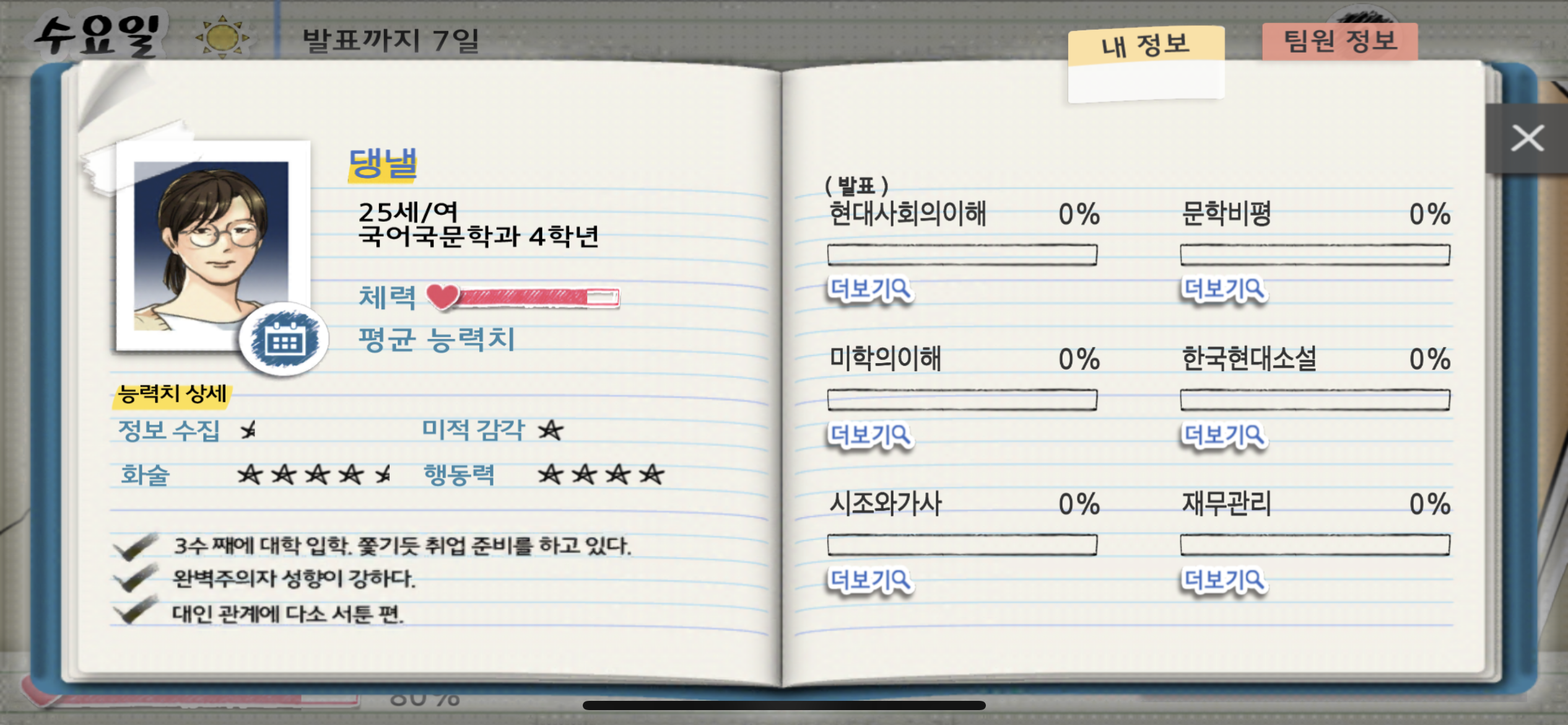 게임은 여섯 캐릭터의 학과와 시간표까지 상세하게 설정해 두었지만 난 팀원의 시간표 따위는 고려하지 않는다. 조별과제만 하면 되는 줄 알았더니 학점을 좋게 받기 위해 나도 수업을 들어야 하기 때문이다.