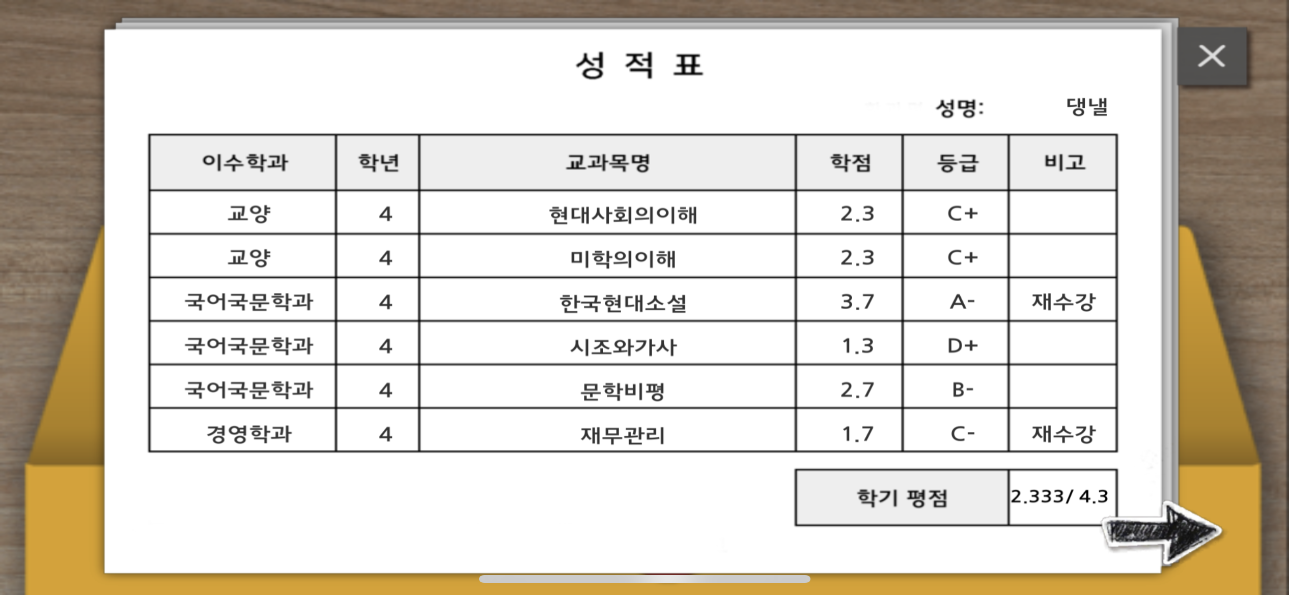 댕낼은 아무래도 계절학기를 듣고 싶나 보다. 부모님께 죄책감이 드는 성적표를 받고 나면 엔딩이 나온다.