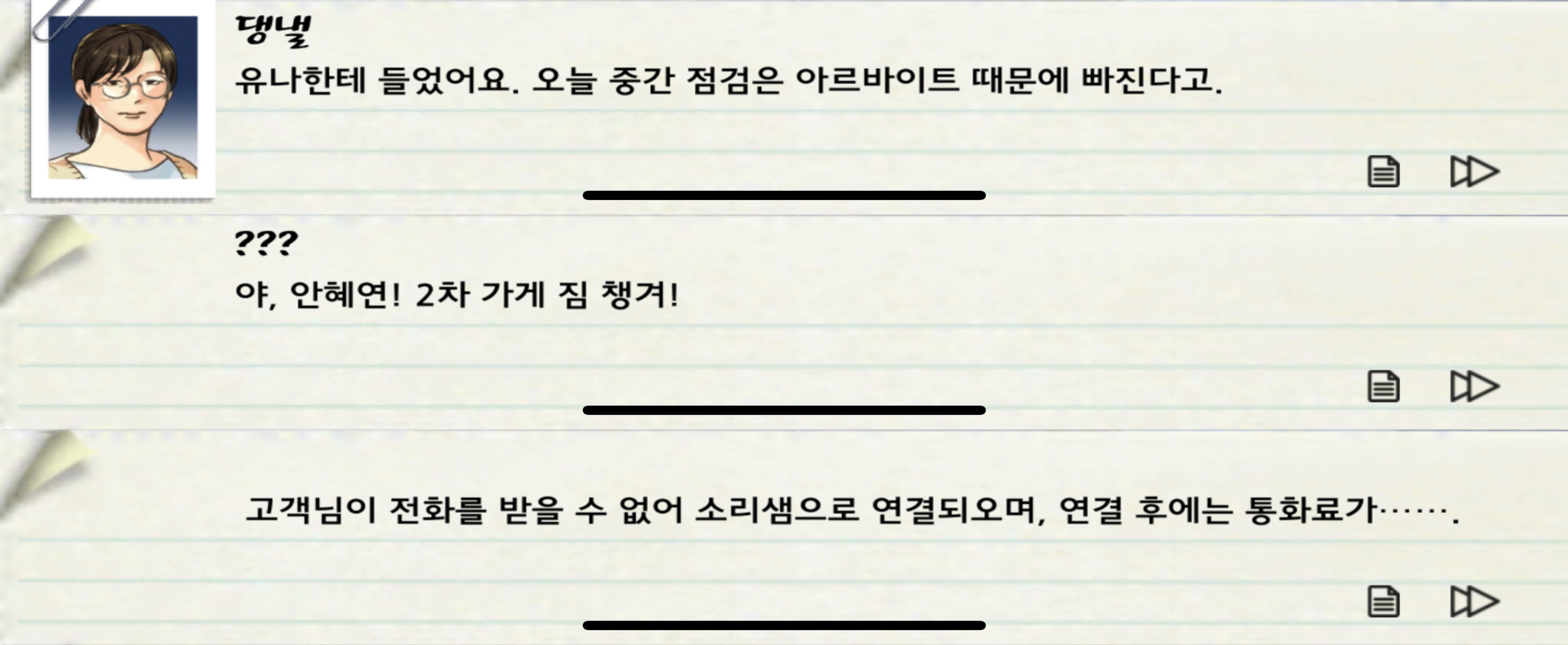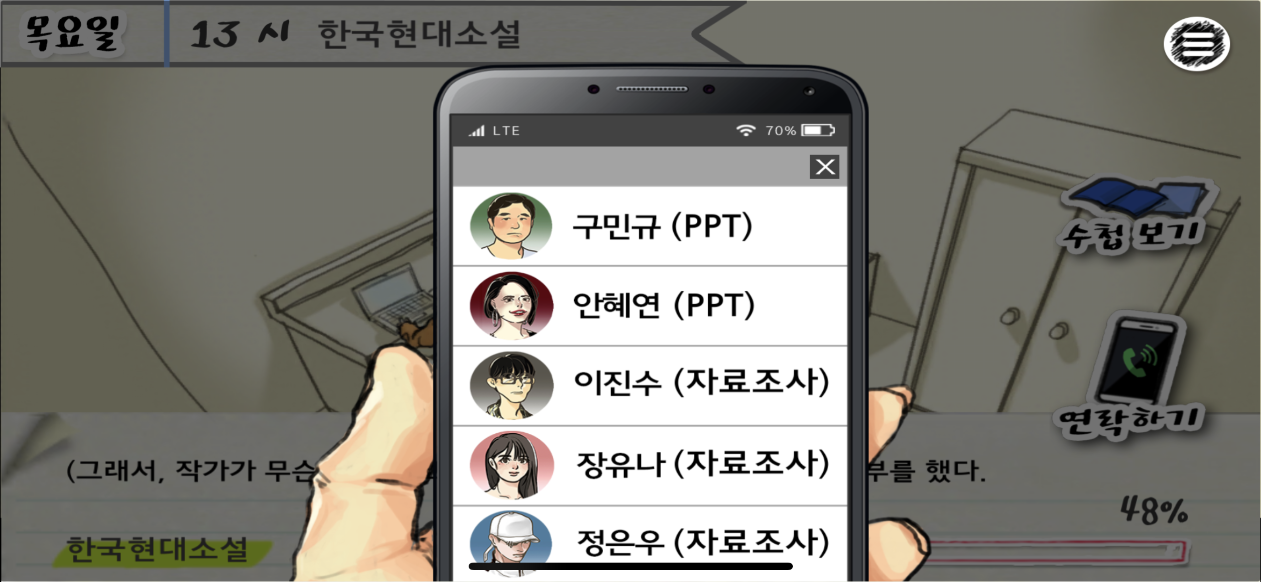 게임은 매일 내가 짜놓은 시간표대로 흘러가며 중간중간 나에게 전화가 오거나 내가 팀원에게 전화를 걸며 이벤트가 발생한다.