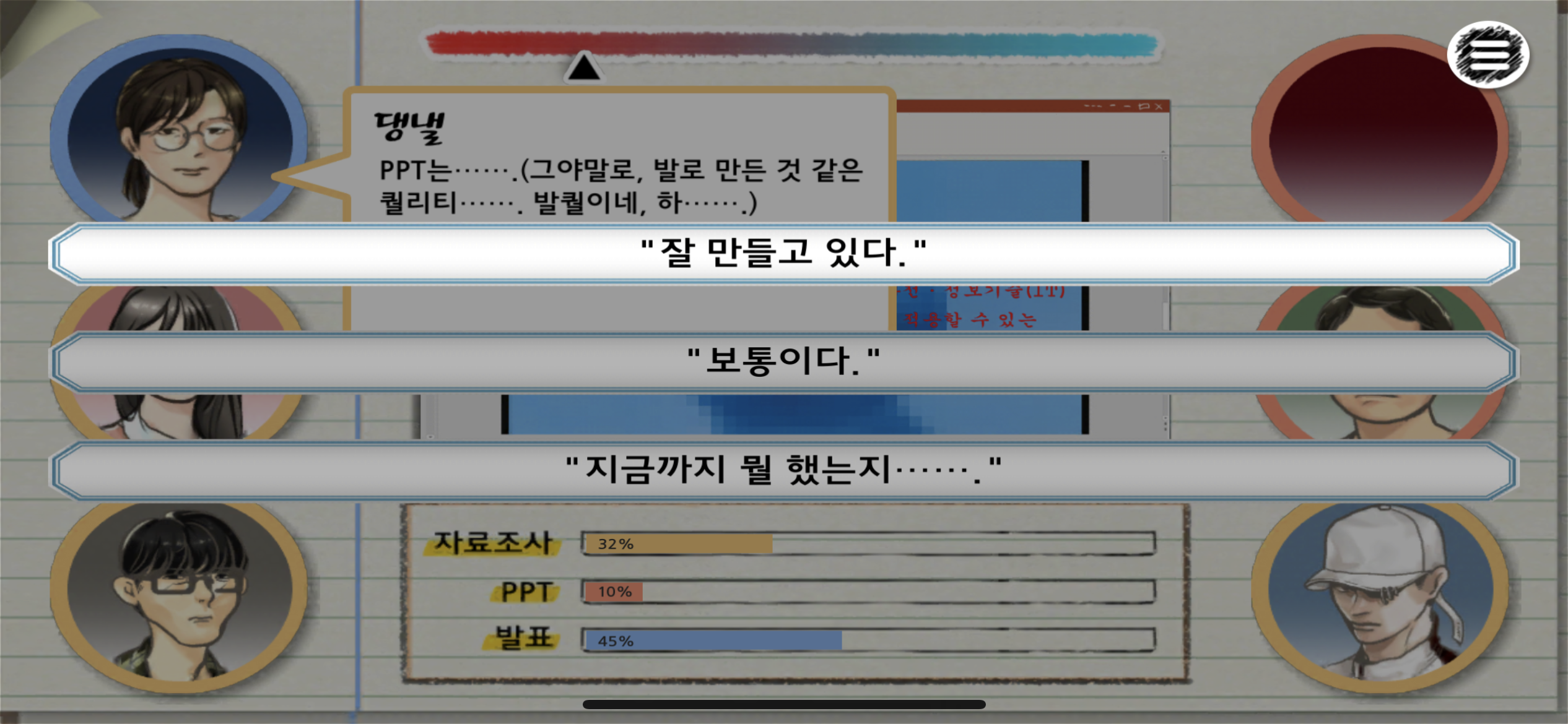 그리고 믿음직한 우리 PPT 담당 조원은 보노보노 PPT를 준비해왔다. 저 이미지 너머 푸르디푸른 이미지가 보노보노다. 화술에 능력치를 몰빵하느라 미적 감각이 별 하나인 나는 세 가지 멘트 중 하나밖에 할 수 없었다. “잘 만들고 있다.”를 누르기 싫어 게임을 그만할까 생각도 했다. 이런 요소가 게임을 여러 번 하게 만드는 중요한 요소다.