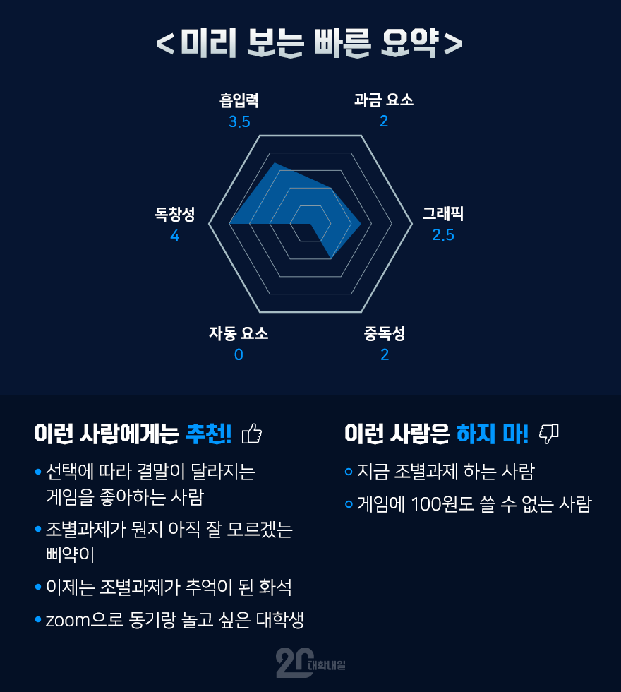 조별과제가 무엇인가? 숨 막히게 어색한 사람들과 강제로 하는, 흑역사와 분노가 뒤섞인 대학생활 지옥편의 결정체다. ‘함께 해서 더러웠고, 다신 만나지 말자’가 절로 나오는 조별과제를 소재로 왜 게임을 만들었을까?