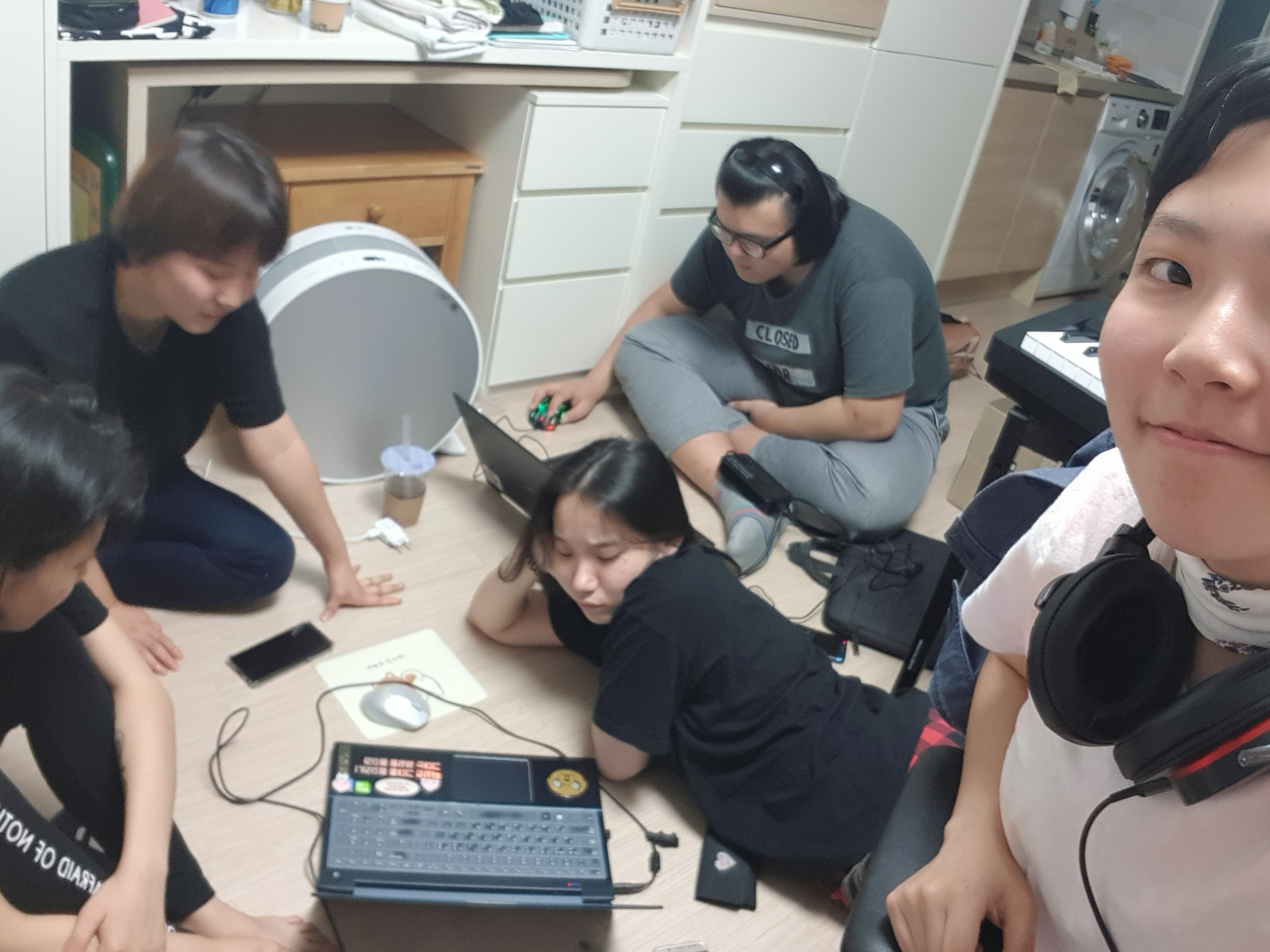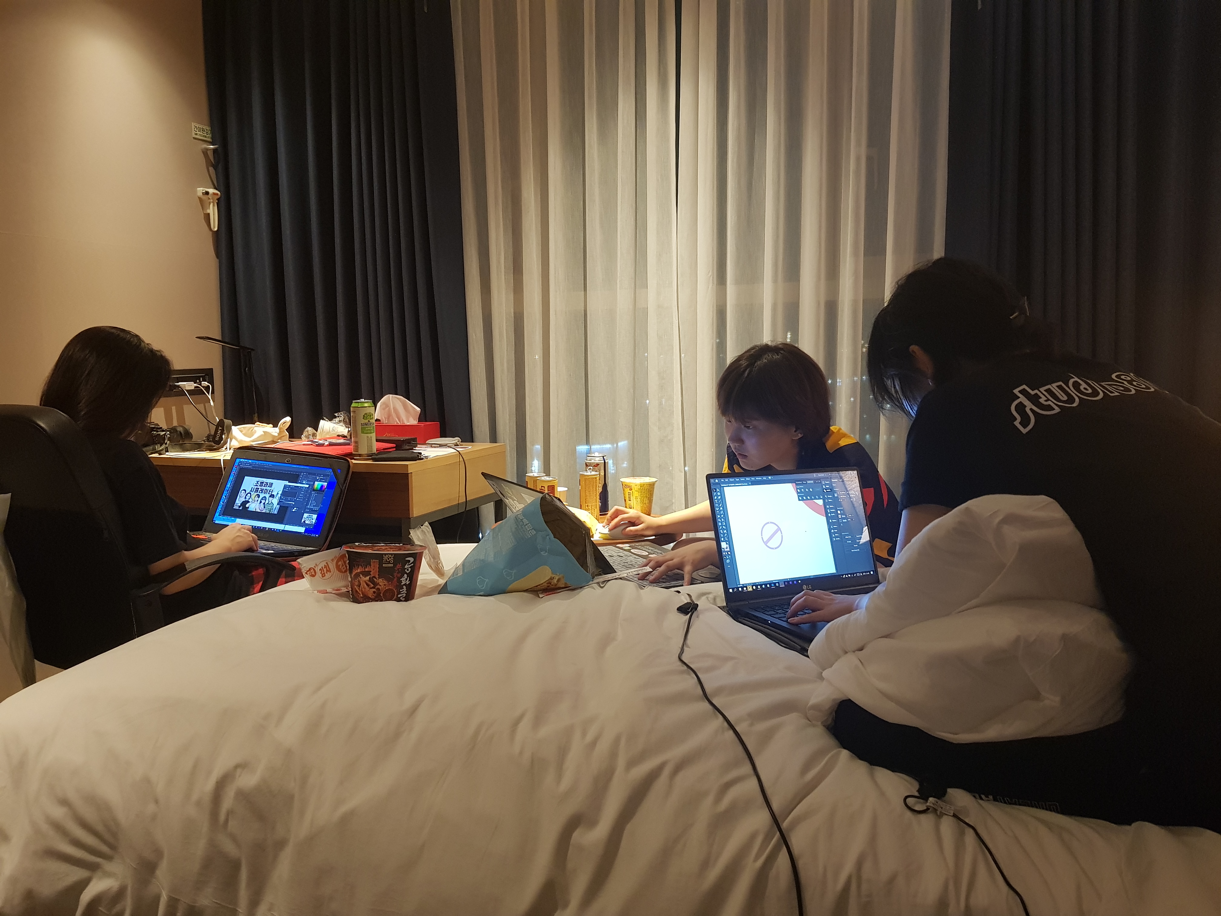 네. 당장 다음 날 게임 시연을 해야되는데 버그가 있는지 게임을 플레이 할수 없었어요. 그래서 관광은 꿈도 못 꾸고 호텔 방에 모여 개발만 했죠.