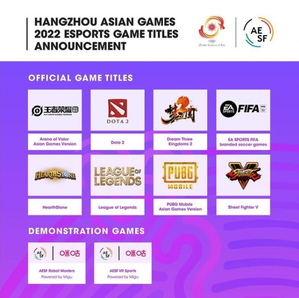 2022 항저우 아시안 게임 e-스포츠 공식 종목. 출처: 인스타그램 @asian.esports