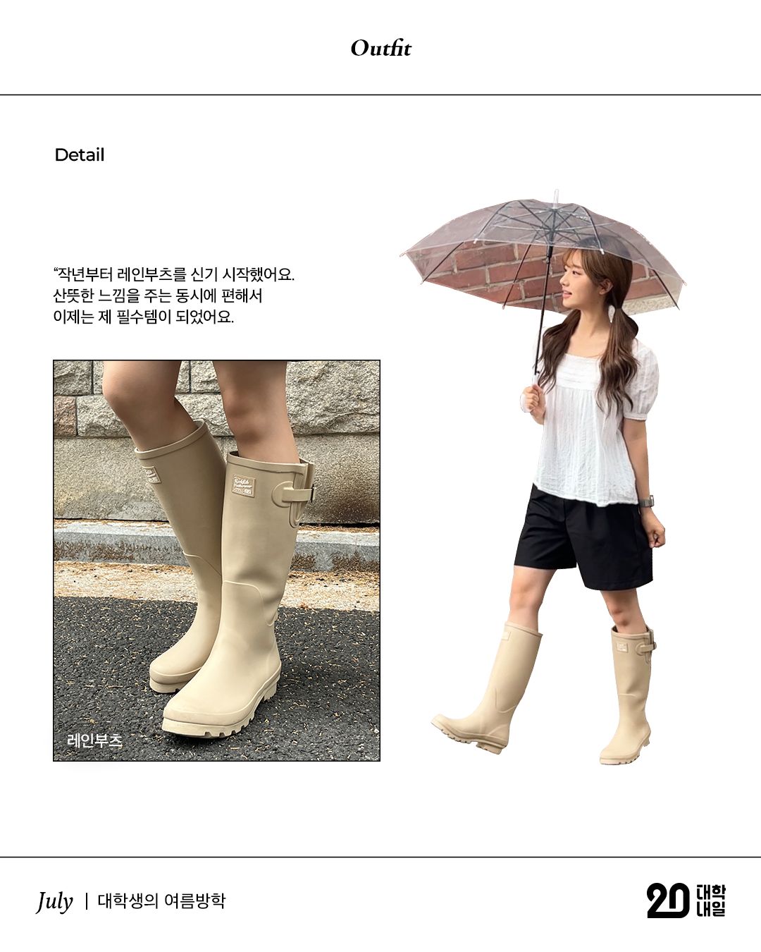 여기에 레인부츠를 매치한 귀여운 코디를 주로 입어요”