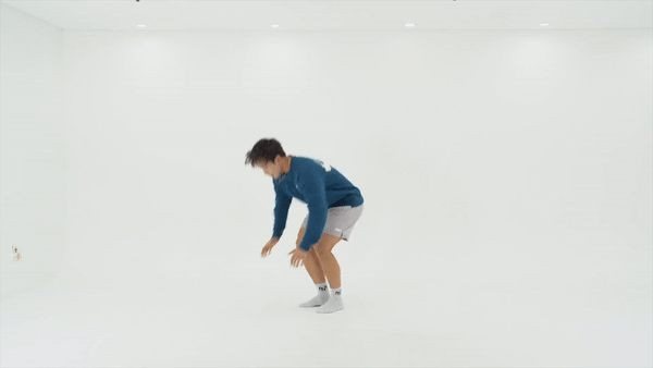 2) 무릎과 허리를 구부려 스쿼트 자세로 앉으며 손으로 바닥을 짚은 뒤 점프한다.