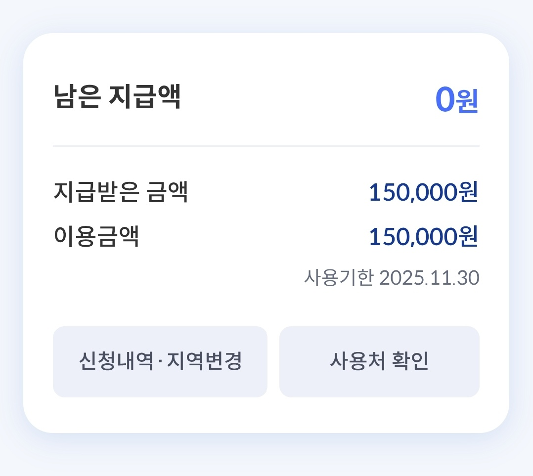 지역 제한을 좀 더 유동적으로 운영해 줬으면 좋겠어요. 주소지랑 실제 소비권역이 다를 수 있잖아요.그리고 온라인 사용도 가능했으면 좋겠고요. 물론, 돈이 더 많았으면 좋겠다는 생각도 솔직히 듭니다!