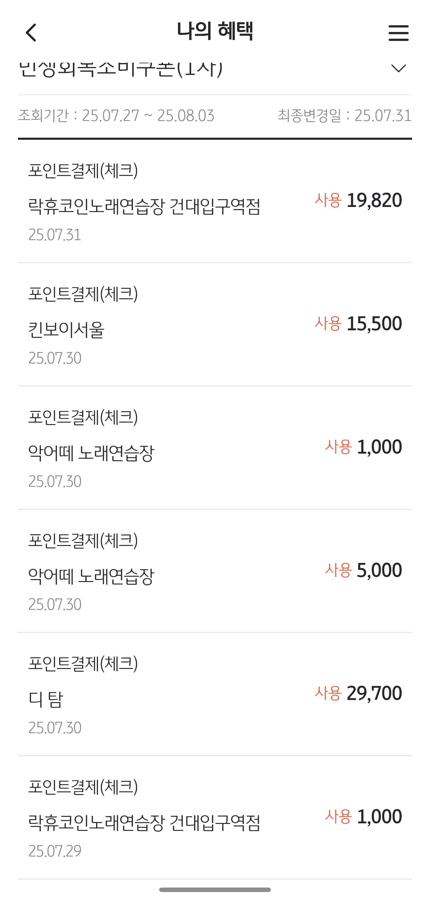 카드에 자동 충전되어 우선 차감되는 방식이었어요. 그래서인지 제 소비 습관이 꽤 적나라하게 드러나더라고요. 식비는 기본이고, 노래방 금액 충전, PC방 시간 충전, 미용실 이용까지.... 생각보다 다양하게 썼어요. 평소에 자주 가는 공간과 소비 방식이 그대로 반영된 셈이죠.