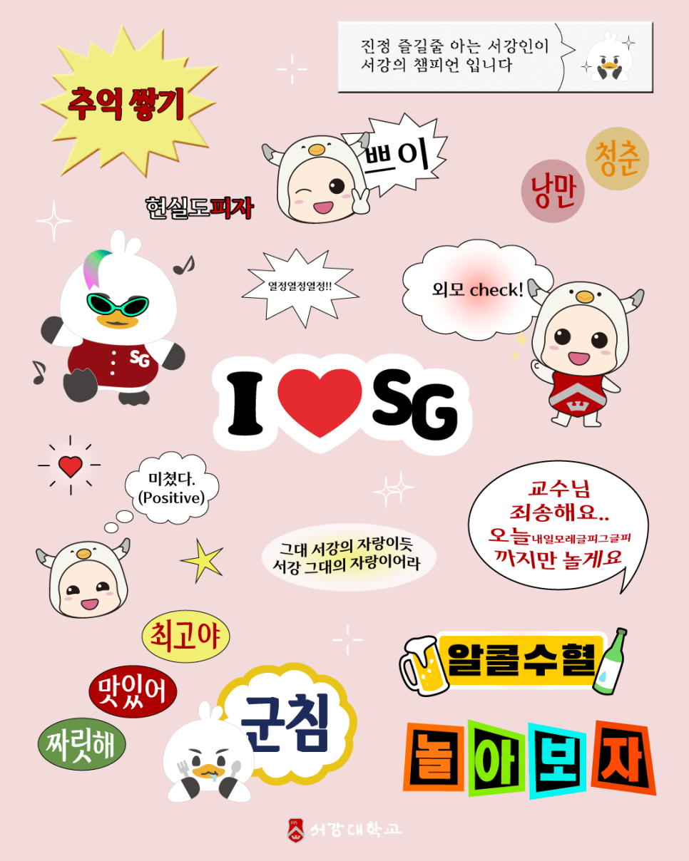 서강대학교의 마스코트는 알바트로스(바다새)를 나타내는 '서강이'와 '알로스'인데, 이들을 캐릭터화시킨 스티커와 그리고 요즘 유행인 텍스트 스티커까지 알차게 구성했다.