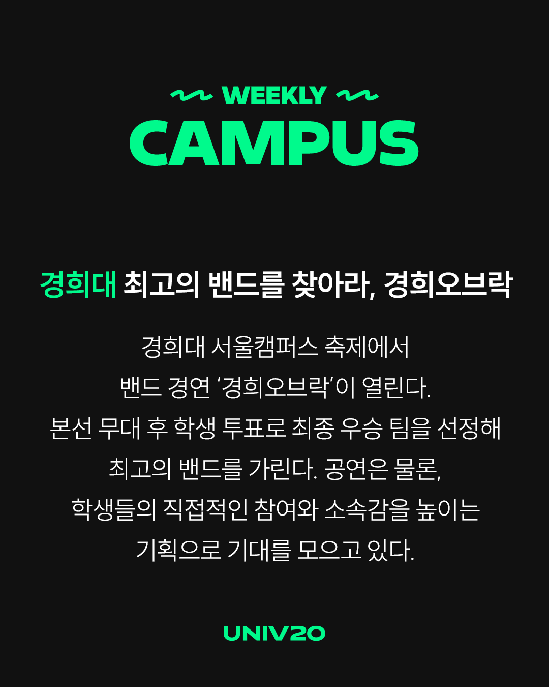 경희대 서울캠퍼스 가을 대동제에서 밴드 경연 ‘경희오브락’이 열린다. 본선 무대 후 학생 투표로 최종 우승팀을 선정해 최고의 밴드를 가린다. 공연은 물론, 학생들의 직접적인 참여와 소속감을 높이는 기획으로 기대를 모으고 있다.