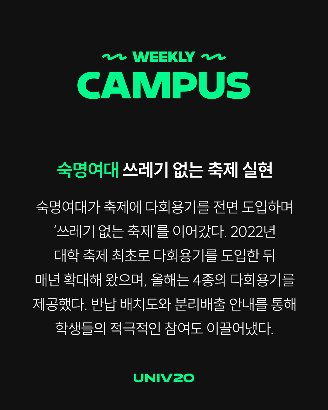 숙명여대가 청파제에 다회용기를 전면 도입하며 ‘쓰레기 없는 축제’를 이어갔다. 2022년 대학 축제 최초로 다회용기를 도입한 뒤 매년 확대해 왔으며, 올해는 4종의 다회용기를 제공했다. 반납 배치도와 분리배출 안내를 통해 학생들의 적극적인 참여도 이끌어냈다.