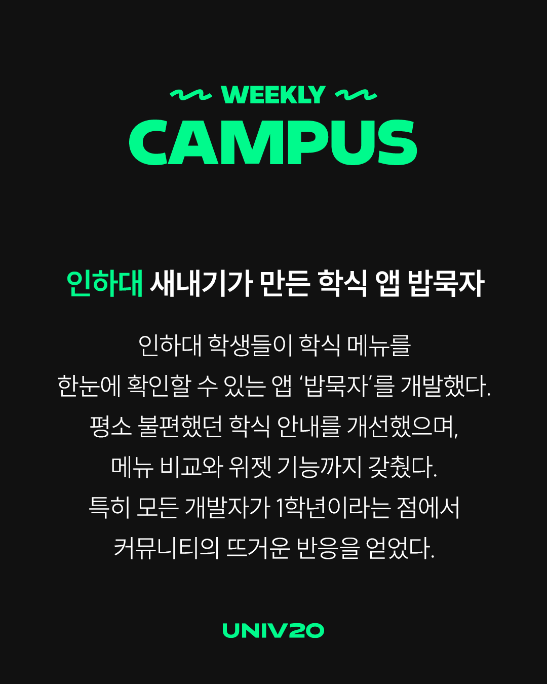인하대 학생들이 학식 메뉴를 한눈에 확인할 수 있는 앱 ‘밥묵자’를 개발했다. 평소 불편했던 학식 안내를 개선했으며, 메뉴 비교와 위젯 기능까지 갖췄다. 특히 모든 개발자가 1학년이라는 점에서 커뮤니티의 뜨거운 반응을 얻었다.