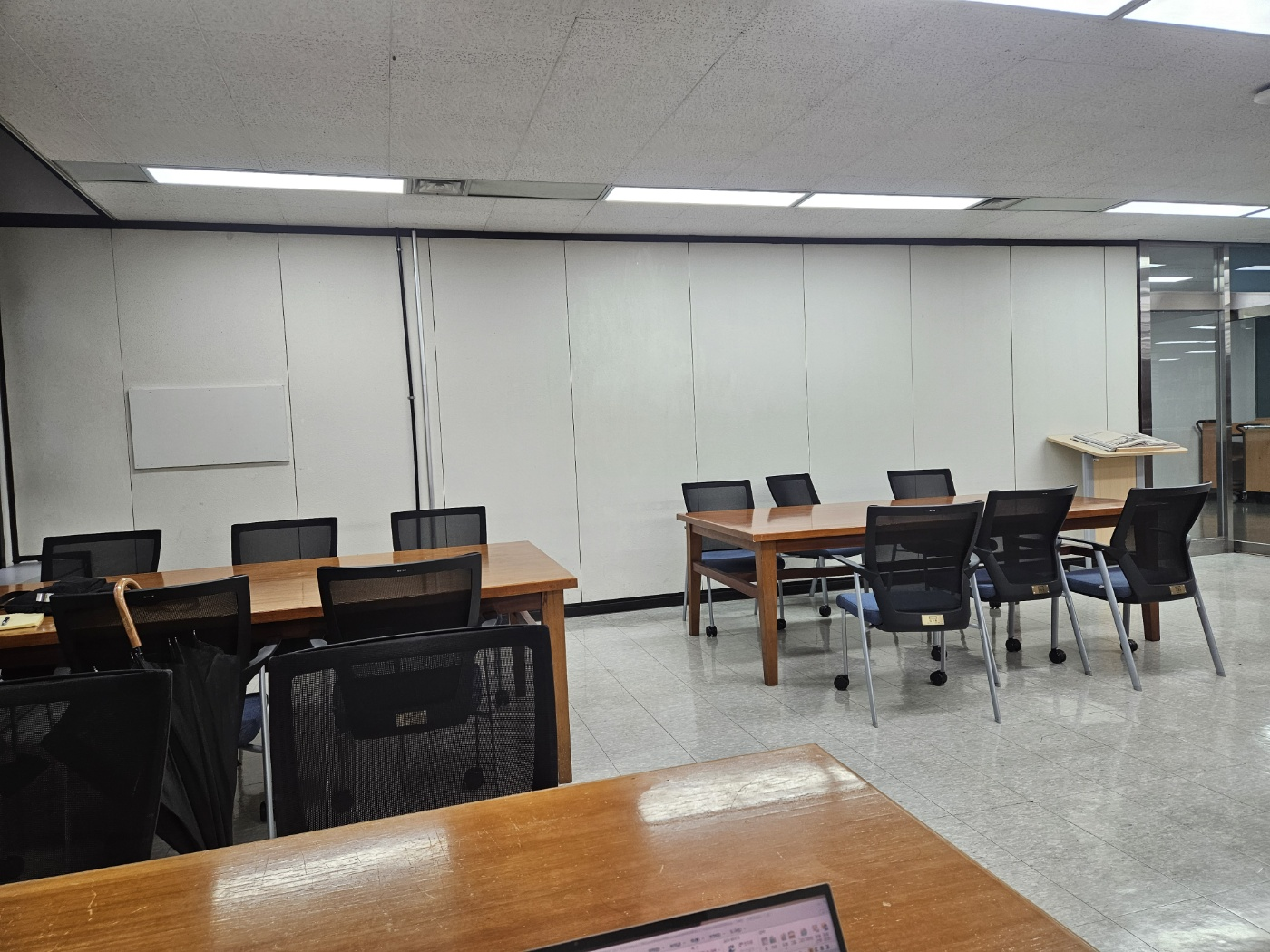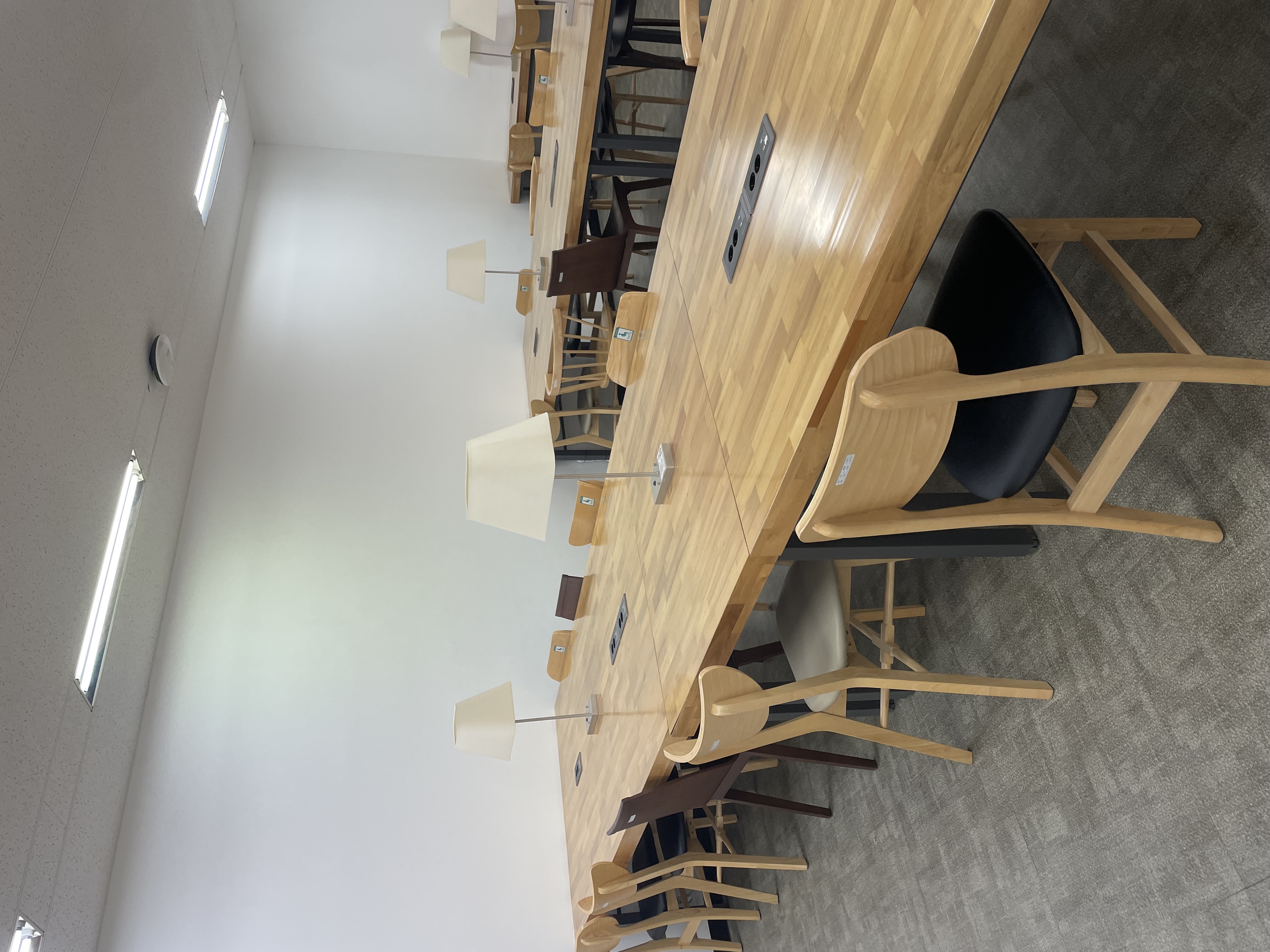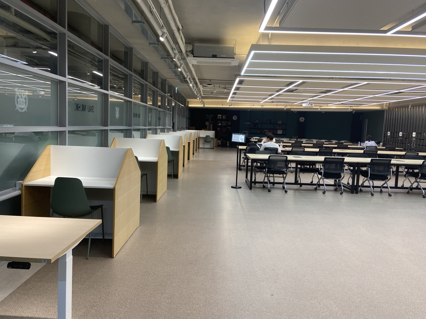 개방된 느낌의 테이블이 오른쪽에 크게 줄지어 있고, 왼쪽에는 칸막이가 있는 아주 큰 1인용 책상이 하나씩 있기 때문에 어디든 골라서 공부할 수 있는 게 좋아. 특히 칸막이가 있으면서도 책상이 커서 폐쇄감이 심하지 않은 게 좋더라고.