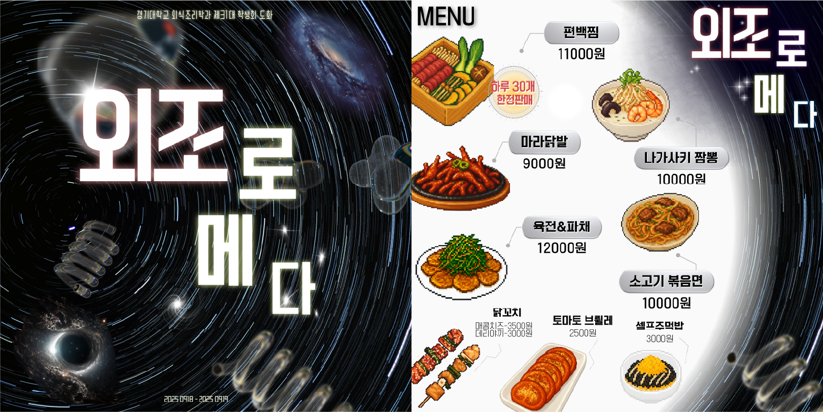이번 경기대학교 서울캠퍼스 축제 콘셉트가 코스믹이어서 외식조리학과와 안드로메다를 합친 ‘외조로메다‘라는 이름으로 주점을 운영했습니다. 우주에서 보는 지구의 음식을 주제로 다양한 나라의 음식을 제공하려고 했죠.