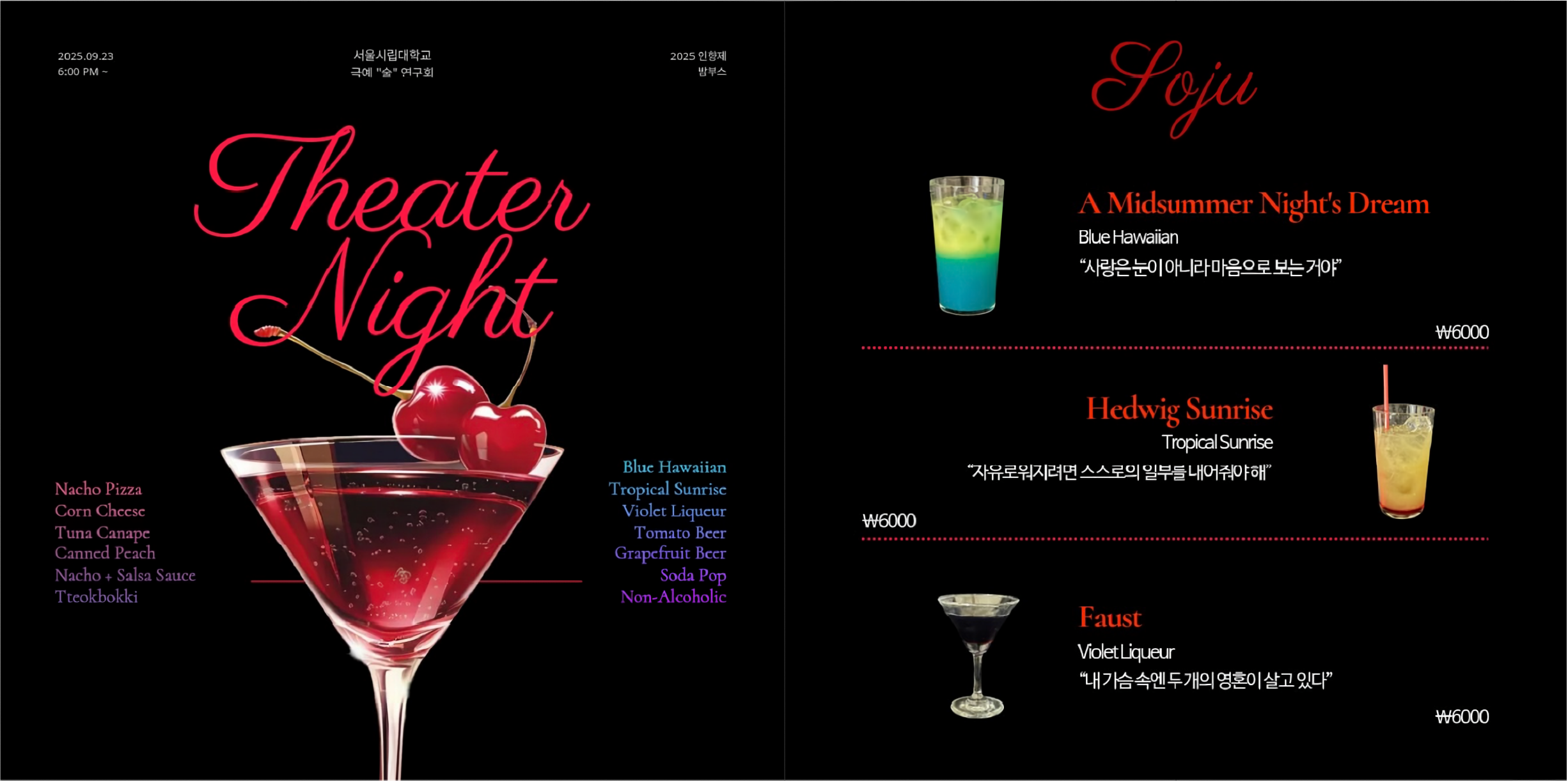 조: 신경 쓴 부분들은 칵테일의 제목들을 연극과 관련된 이름으로 만들었고, 계절에 맞게 시원하고 새콤달콤한 메뉴들을 추가했다는 점이었습니다. 서빙하는 인원들도 실제 연극에서 입었던 의상들을 입고 움직였는데, 이런 요소들을 찾아와 주시는 분들이 즐기는 동시에 저희 연극에도 관심을 가져주셨으면 하는 마음이었습니다.