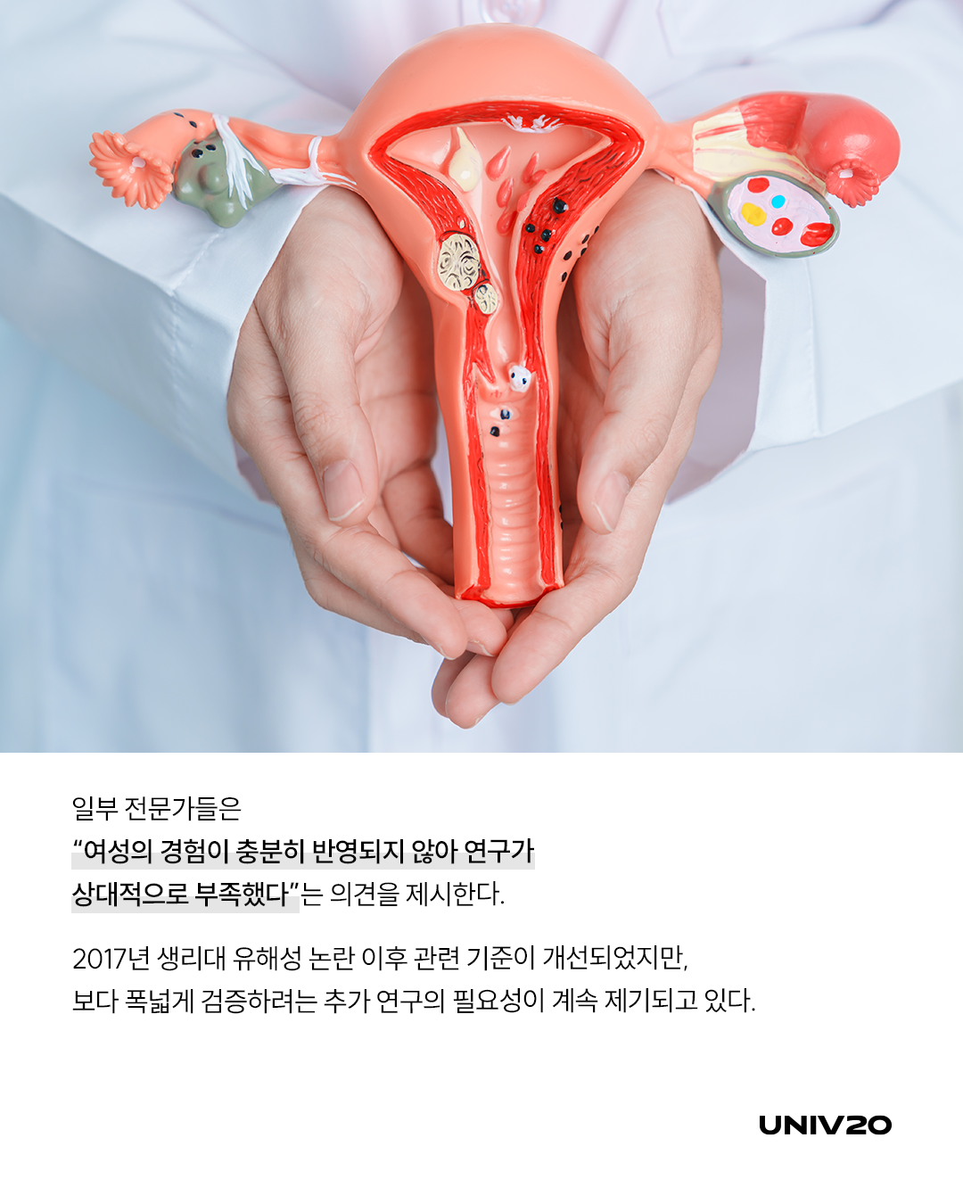 일부 전문가들은 "여성의 경험이 충분히 반영되지 않아 연구가 상대적으로 부족했다"는 의견을 제시한다. 2017년 생리대 유해성 논란 이후 관련 기준이 개선되었지만, 보다 폭넓게 검증하려는 추가 연구의 필요성이 계속 제기되고 있다.