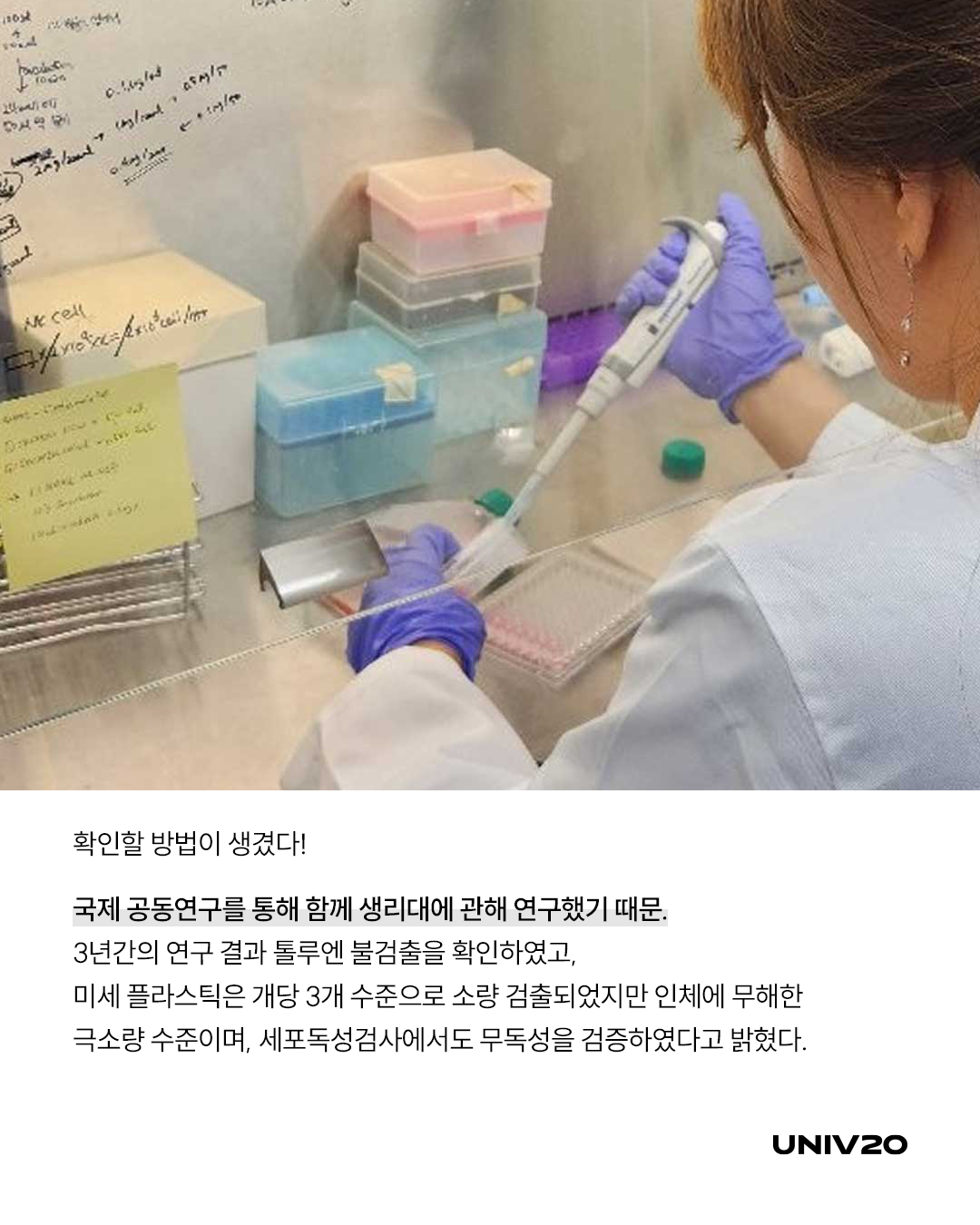 국제 공동연구를 통해 함께 생리대에 관해 연구했기 때문. 3년간의 연구 결과 톨루엔 불검출을 확인하였고, 미세 플라스칙은 개당 3개 수준으로 소량 검출되었지만 인체에 무해한 극소량 수준이며, 세포독성검사에서도 무독성을 검증하였다고 밝혔다.