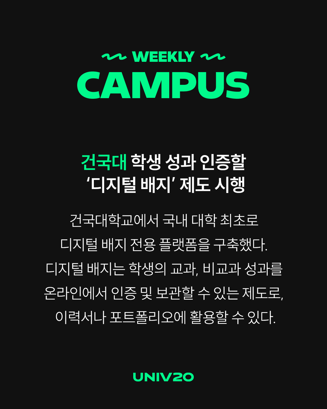 건국대학교에서 국내 대학 최초로 디지털 배지 전용 플랫폼을 구축했다. 디지털 배지는 학생의 교과, 비교과 성과를 온라인에서 인증 및 보관할 수 있는 제도로, 이력서나 포트폴리오에 활용할 수 있다.