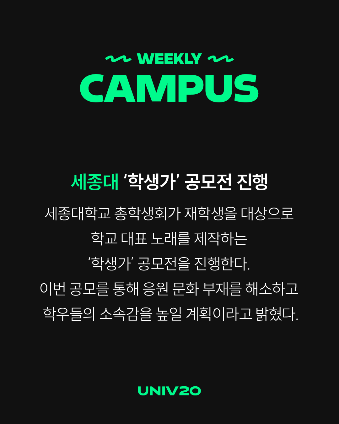 세종대학교 총학생회가 재학생을 대상으로 학교 대표 노래를 제작하는 ‘학생가’ 공모전을 진행한다. 이번 공모를 통해 응원 문화 부재를 해소하고 학우들의 소속감을 높일 계획이라고 밝혔다.
