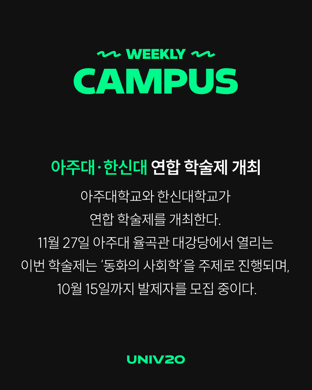 아주대학교와 한신대학교가 연합 학술제를 개최한다. 11월 27일 아주대 율곡관 대강당에서 열리는 이번 학술제는 ‘동화의 사회학’을 주제로 진행되며, 10월 15일까지 발제자를 모집 중이다.