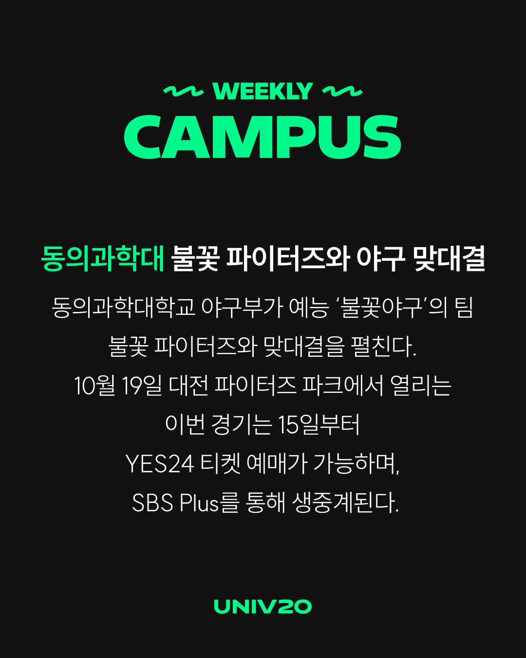 동의과학대학교 야구부가 예능 ‘불꽃야구’의 팀 불꽃 파이터즈와 맞대결을 펼친다. 10월 19일 대전 파이터즈 파크에서 열리는 이번 경기는 15일부터 YES24 티켓 예매가 가능하며, SBS Plus를 통해 생중계된다.