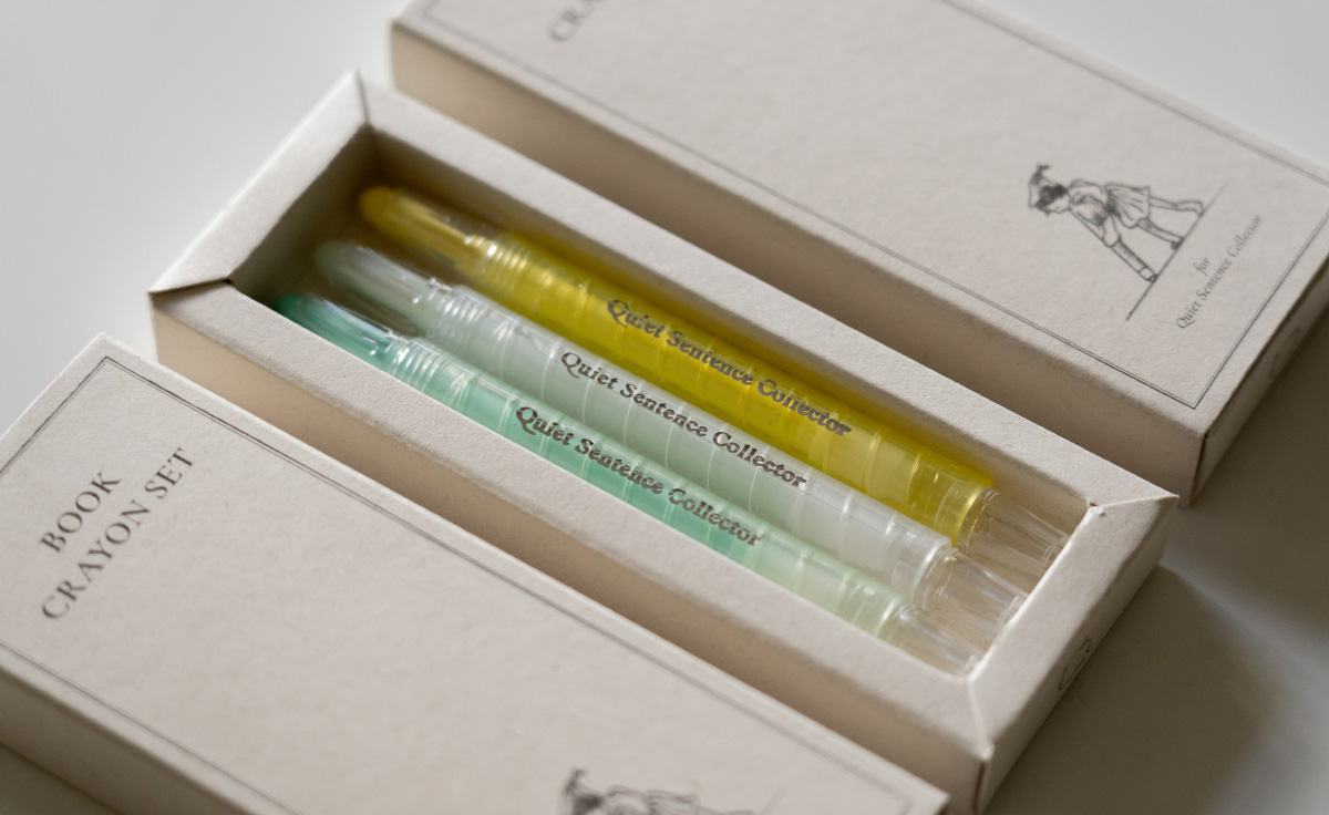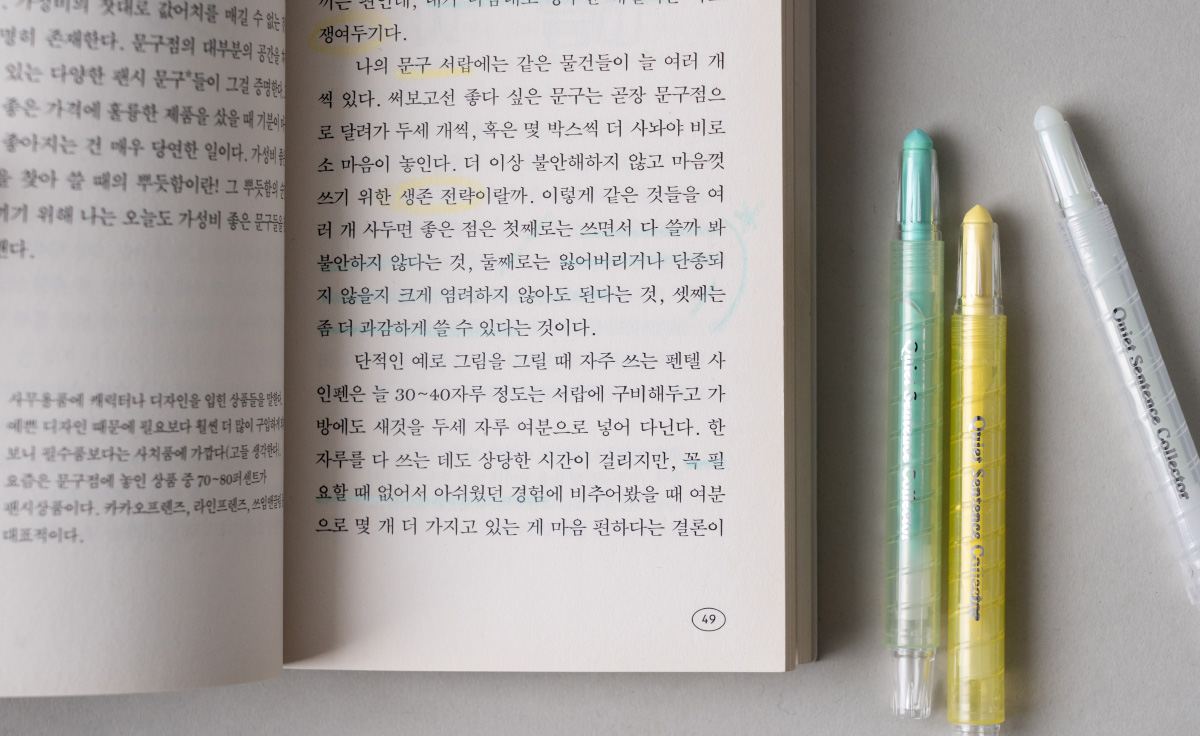 출처: POINT OF VIEW 공식 홈페이지독서인은 두 타입으로 나뉜다. ‘마음에 드는 문장은 바로 밑줄’ 파 vs ‘책은 무조건 깨끗하게 보존’ 파. 이번 아이템은 전자의 사람들을 위해 준비했다. 밑줄은 긋고 싶은데, 형광펜은 종이에 잉크가 물들어 꺼려진다면 이 색연필을 써보자. 민트색, 노란색, 투명색의 은은한 색으로, 일반 색연필에서는 흔하게 볼 수 없는 파스텔 색감의 색연필이다. 투명하게 그어지는 선이 문장을 더욱 감성적으로 강조해 준다. 마음에 드는 문장을 발견했을 때의 두근거림을, 밑줄을 그어 표현해 보자.