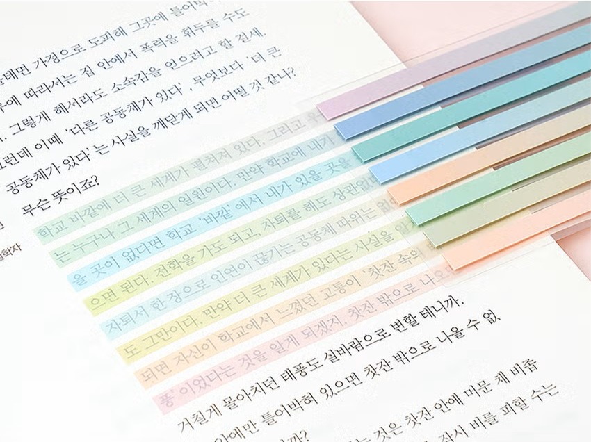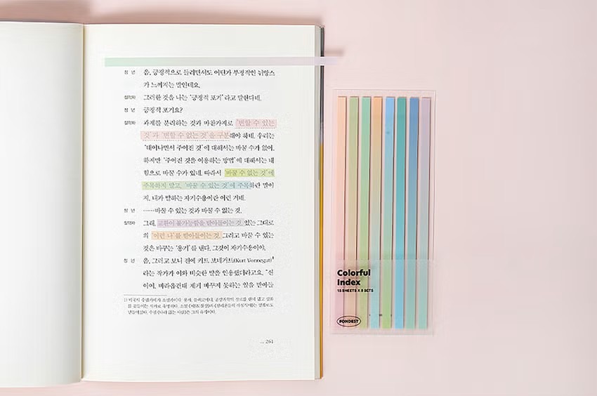 앞서 색연필을 보며 마음이 조금은 불편했을 ‘책은 무조건 깨끗하게 보존’ 파 사람들을 위한 아이템이다. 책에 직접 밑줄을 긋지 않아도, 마치 형광펜을 그은 것처럼 보이게 해주는 인덱스 스티커이다. 다이소 제품이라 가격은 무려 1천 원. 부담 없이 여러 개 사서 마음껏 쓸 수 있다. 탈부착이 쉽고, 자국이 남지 않아 책을 훼손할 걱정도 없다. 책 밖으로 길게 붙이면 책갈피로도 쓸 수 있으니, 만능 아이템이다. 책이 상할까 연필로 살며시 밑줄을 그어왔다면, 이 인덱스 스티커를 추천한다.