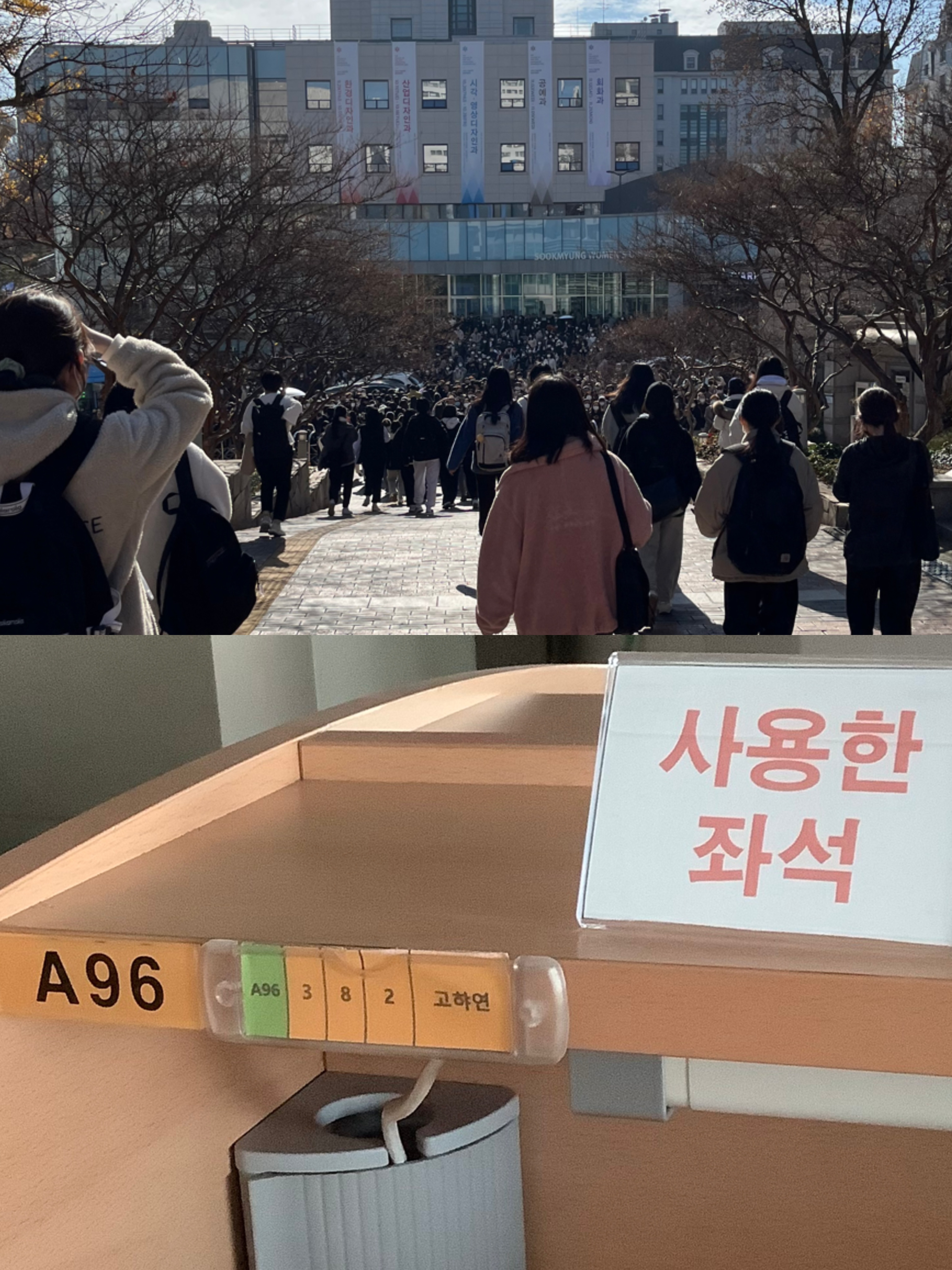 고사장 입구에는 학교 후배들이 아침 일찍부터 응원하고 있었어요. 학교 전통 응원 구호를 들으면서 입구를 지나갈 때 기분이 새로웠죠. 저도 1, 2학년 때 선배들을 응원하러 갔는데, 응원받는 입장에서의 기분은 완전히 달랐어요.