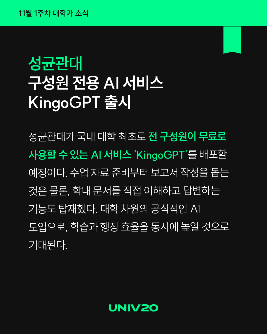 성균관대가 국내 대학 최초로 전 구성원이 무료로 사용할 수 있는 AI 서비스 ‘KingoGPT’를 배포할 예정이다. 수업 자료 준비부터 보고서 작성을 돕는 것은 물론, 학내 문서를 직접 이해하고 답변하는 기능도 탑재했다. 대학 차원의 공식적인 AI 도입으로, 학습과 행정 효율을 동시에 높일 것으로 기대된다.