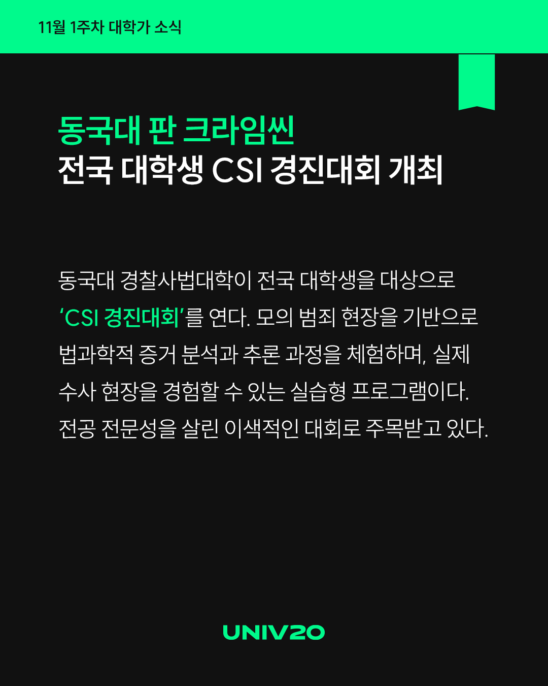 동국대 경찰사법대학이 전국 대학생을 대상으로 ‘CSI 경진대회’를 연다. 모의 범죄 현장을 기반으로 법과학적 증거 분석과 추론 과정을 체험하며, 실제 수사 현장을 경험할 수 있는 실습형 프로그램이다. 전공 전문성을 살린 이색적인 대회로 주목받고 있다.