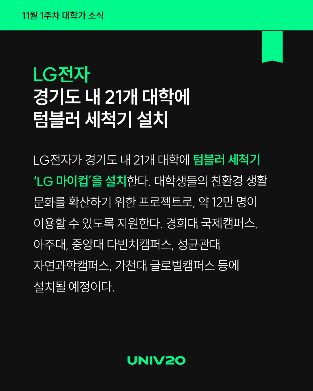 LG전자가 경기도 내 21개 대학에 텀블러 세척기 ‘LG 마이컵’을 설치한다. 대학생들의 친환경 생활 문화를 확산하기 위한 프로젝트로, 약 12만 명이 이용할 수 있도록 지원한다. 경희대 국제캠퍼스, 아주대, 중앙대 다빈치캠퍼스, 성균관대 자연과학캠퍼스, 가천대 글로벌캠퍼스 등에 설치될 예정이다.