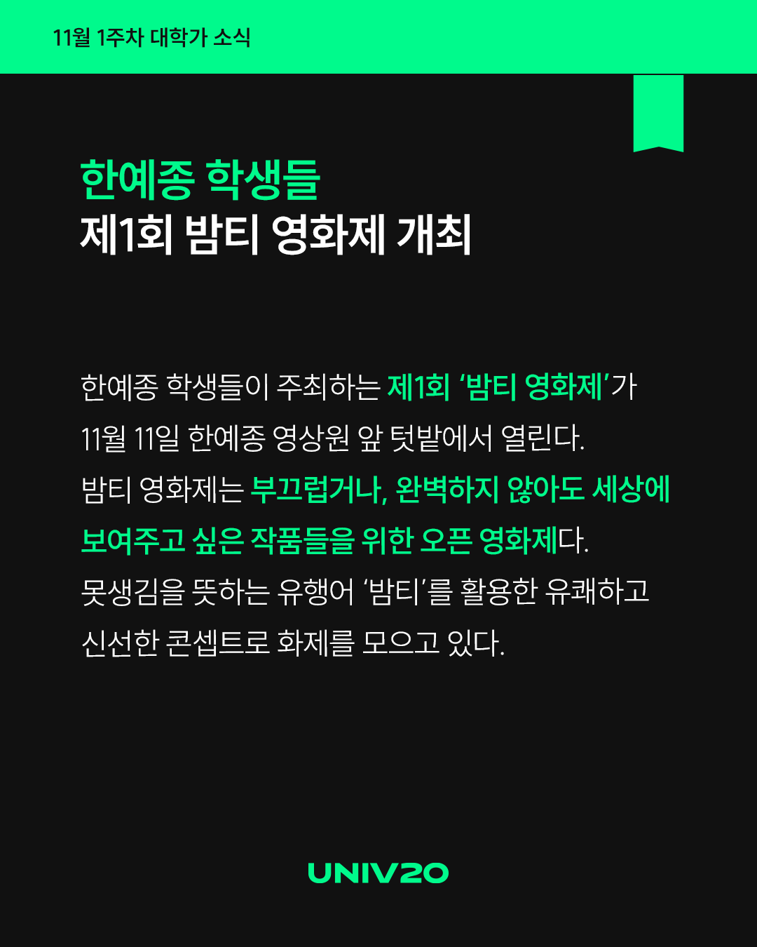 한예종 학생들이 주최하는 제1회 ‘밤티 영화제’가 11월 11일 한예종 영상원 앞 텃밭에서 열린다. 밤티 영화제는 부끄럽거나, 완벽하지 않아도 세상에 보여주고 싶은 작품들을 위한 오픈 영화제다. 못생김을 뜻하는 유행어 ‘밤티’를 활용한 유쾌하고 신선한 콘셉트로 화제를 모으고 있다.