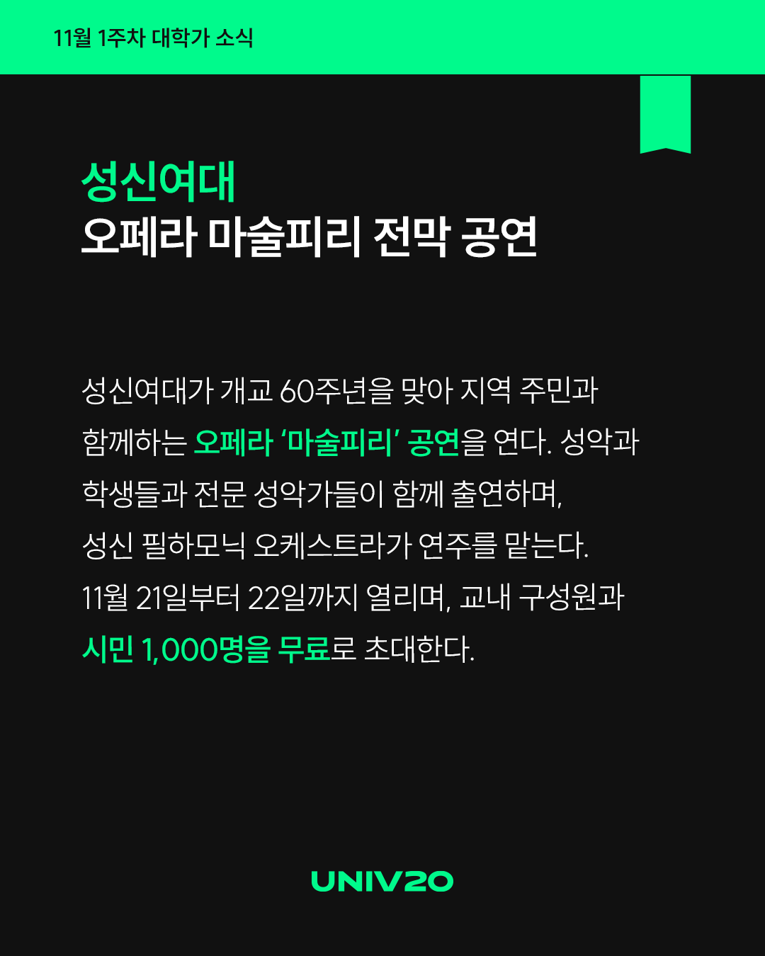 성신여대가 개교 60주년을 맞아 지역 주민과 함께하는 오페라 ‘마술피리’ 공연을 연다. 성악과 학생들과 전문 성악가들이 함께 출연하며, 성신 필하모닉 오케스트라가 연주를 맡는다. 11월 21일부터 22일까지 열리며, 교내 구성원과 시민 1,000명을 무료로 초대한다.