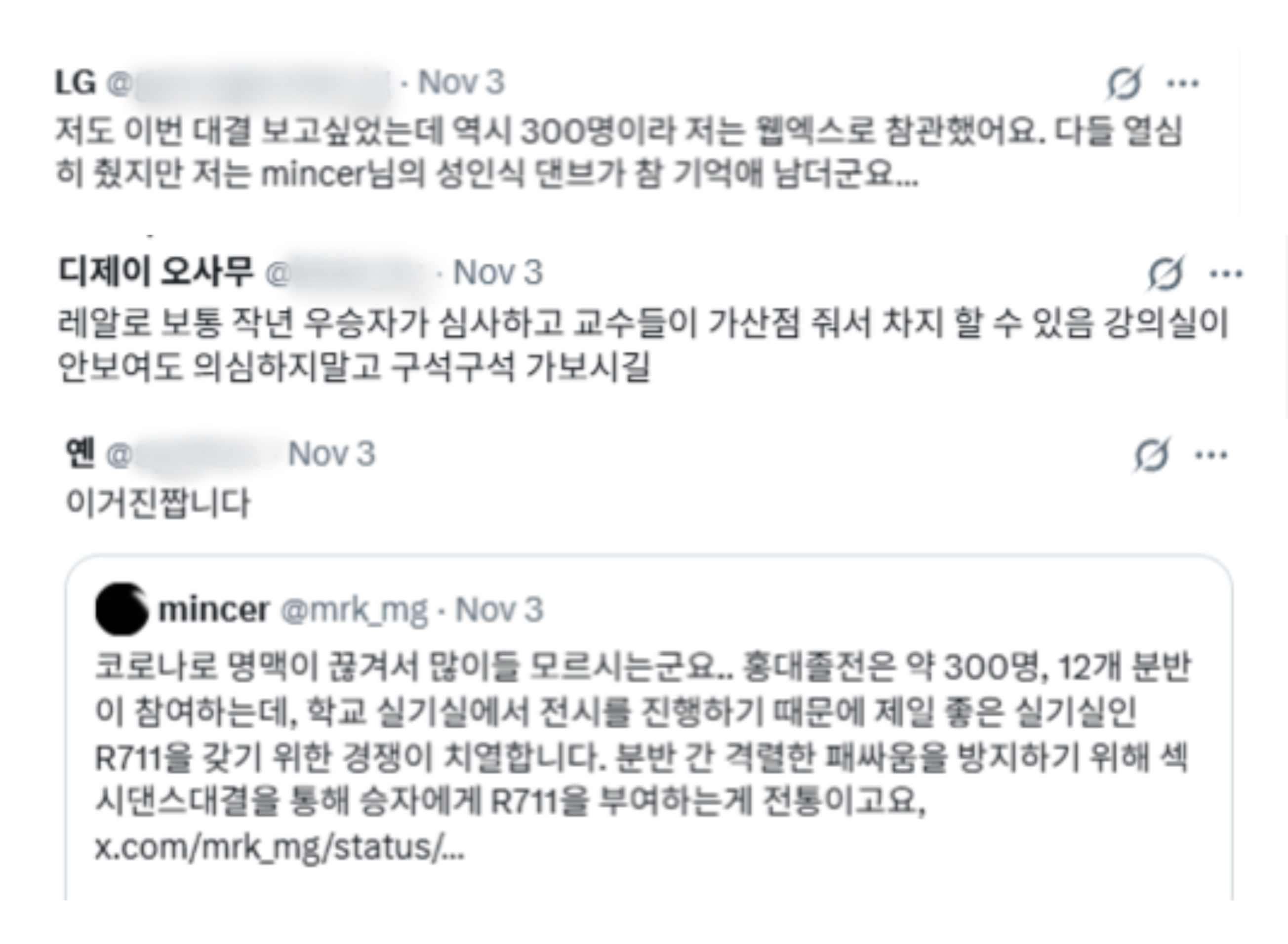 게시글이 올라간 지 얼마 되지 않았을 때, 같은 과 친구가 지인으로부터 홍대 시디에서 진짜로 섹시 댄스를 추는 것인지 묻는 연락을 받았습니다. 이런 전통이 있는 줄 몰랐다는 1학년 후배들도 있었습니다. 저는 선배로서 올바르게 행동하자는 마음가짐으로, 전부 사실이고 너희도 3년 뒤 섹시 댄스를 춰야 한다고 말해줬습니다.